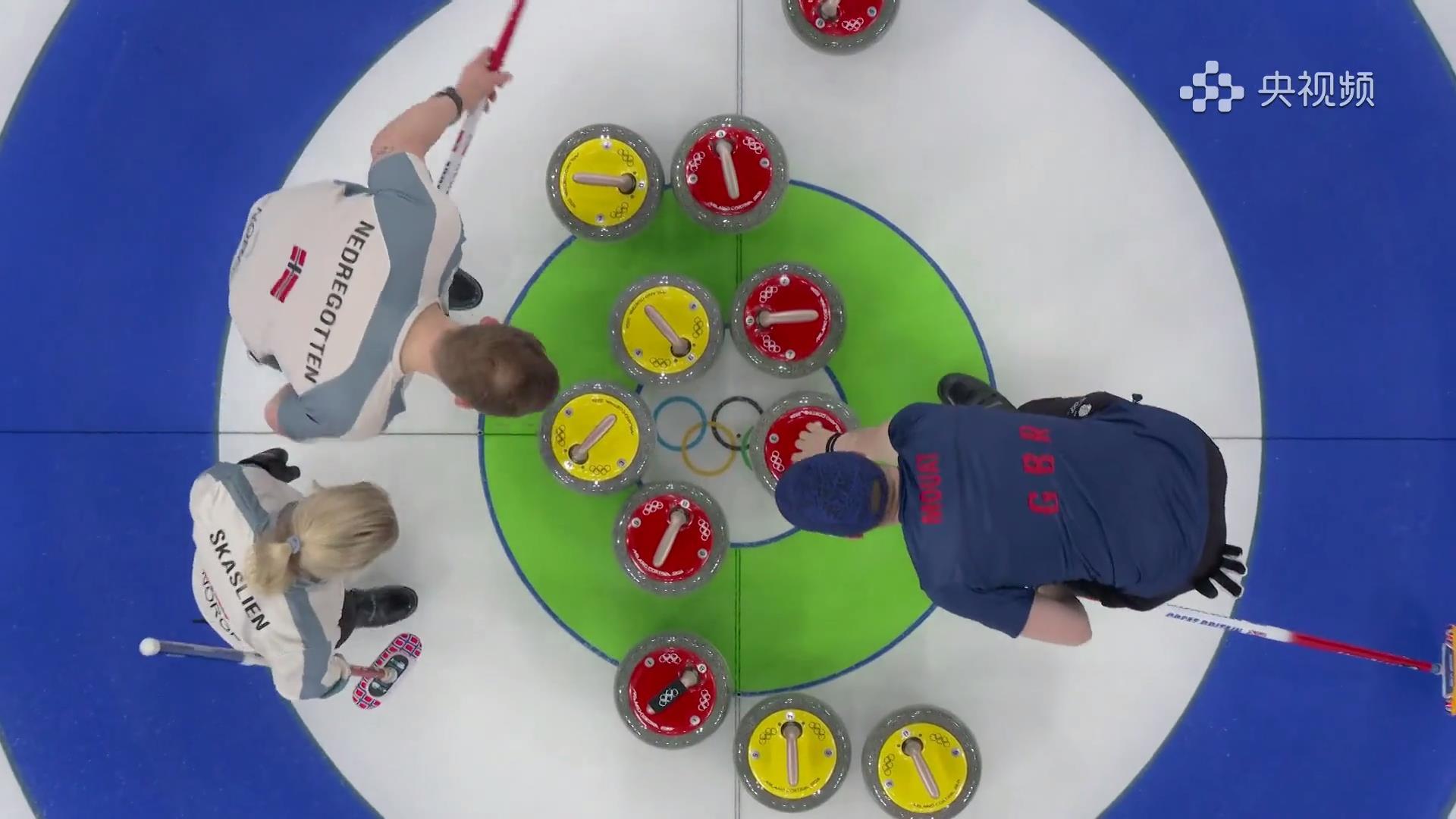 混双第一轮循环赛 英国对挪威第二局体现了混双的技战术特点,很多局面就是中区缠斗,不断在中区加码,英国二三近和挪威一近很难肉眼分出远近,最终英国二三近都通过圆规测量得分,这一局英国拿三分