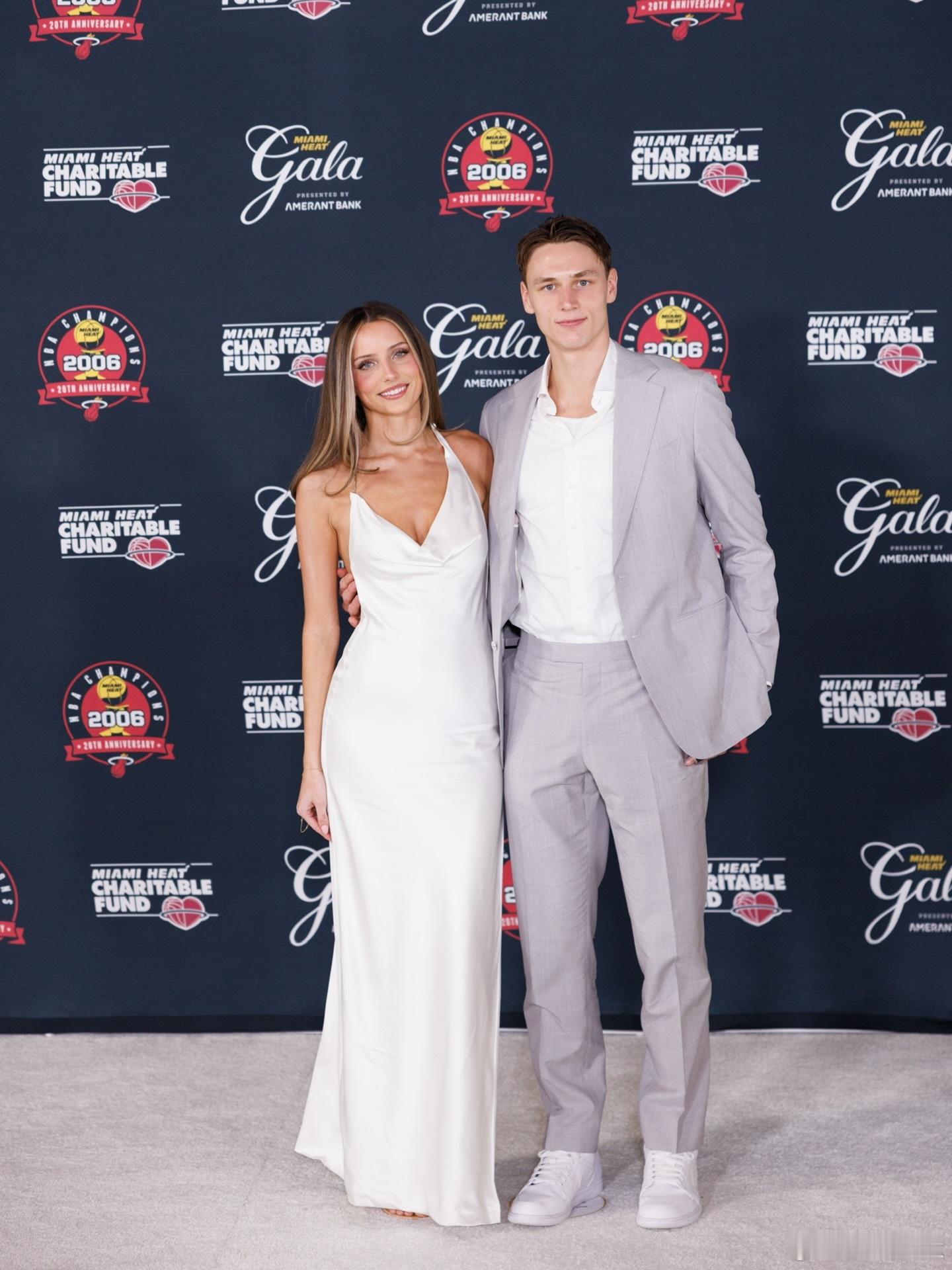 男才女貌,拉尔松和女友一起打卡热火更衣室!拉尔松一身浅灰西装+白球鞋,干净清爽的北欧男友风;女友缎面长裙高开叉,优雅又有气场。2026nba全明星nba常规赛