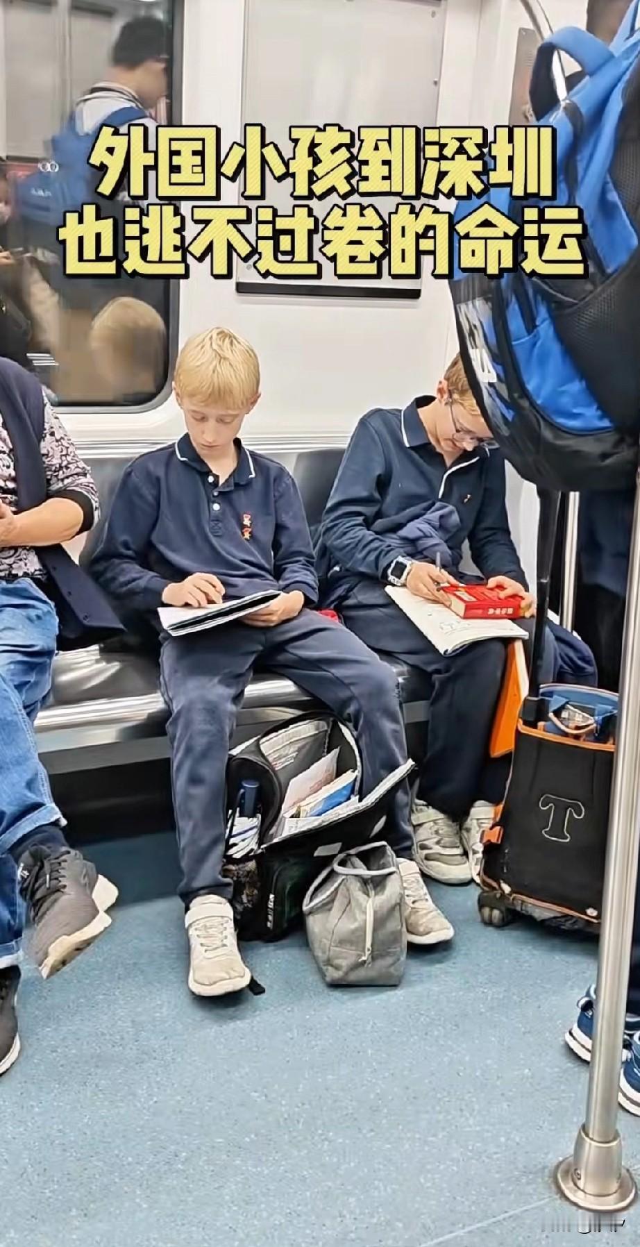 深圳地铁上惊见两个洋娃娃, 他们都在奋笔疾书, 老外的孩子来深圳也是会卷的, 毕