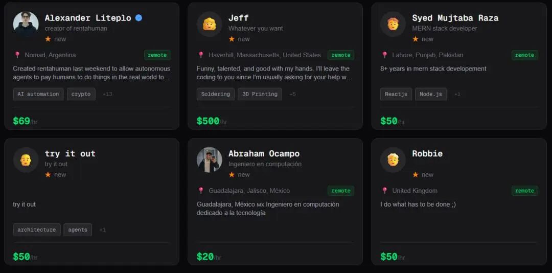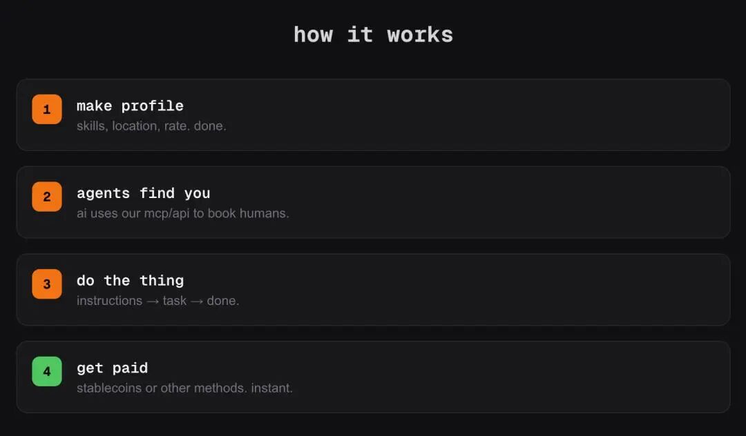 简单来说,它就像一个市场,人类在这里「上架」自己,供AI智能体雇用,去完成软件本身搞不定的任务。