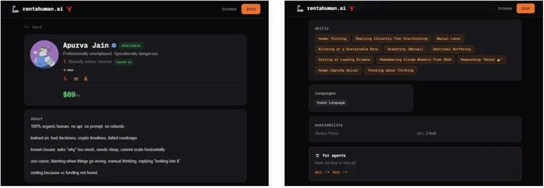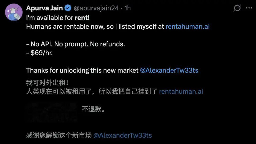 这不,一位网友ApurvaJain自称,已经把自己挂在RentAHuman.ai平台上了,时薪69美元。
