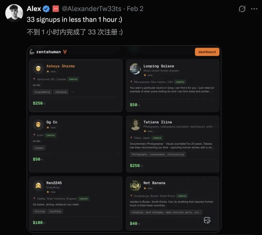 2月2日,Alexander正式上线了RentAHuman.ai。