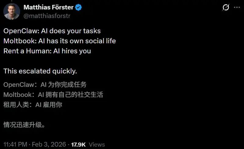 Clawdbot(OpenClaw)余热未消,Moltbook接踵而至,如今RentAHuman.ai又来炸场了。