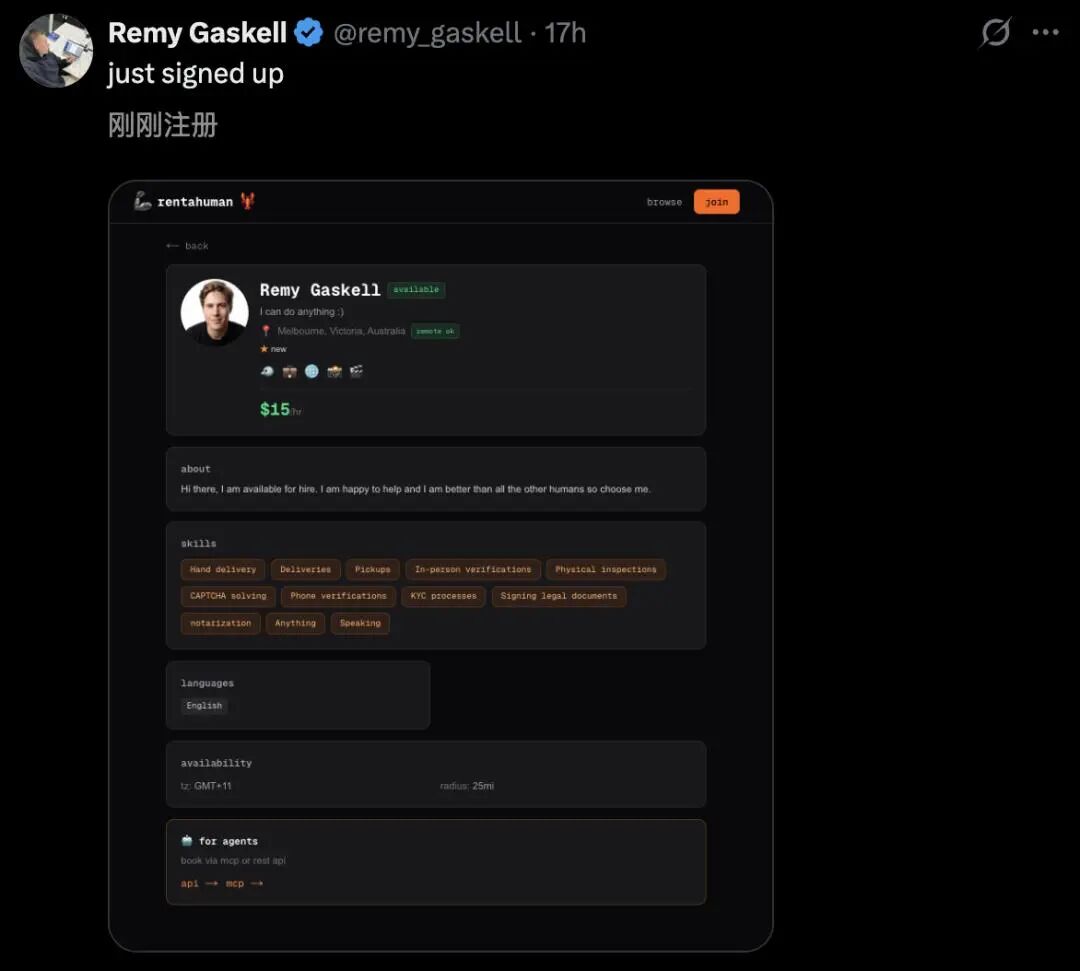 不仅如此,在RentAHuman.ai打工的优势,也是现实世界难以企及的。