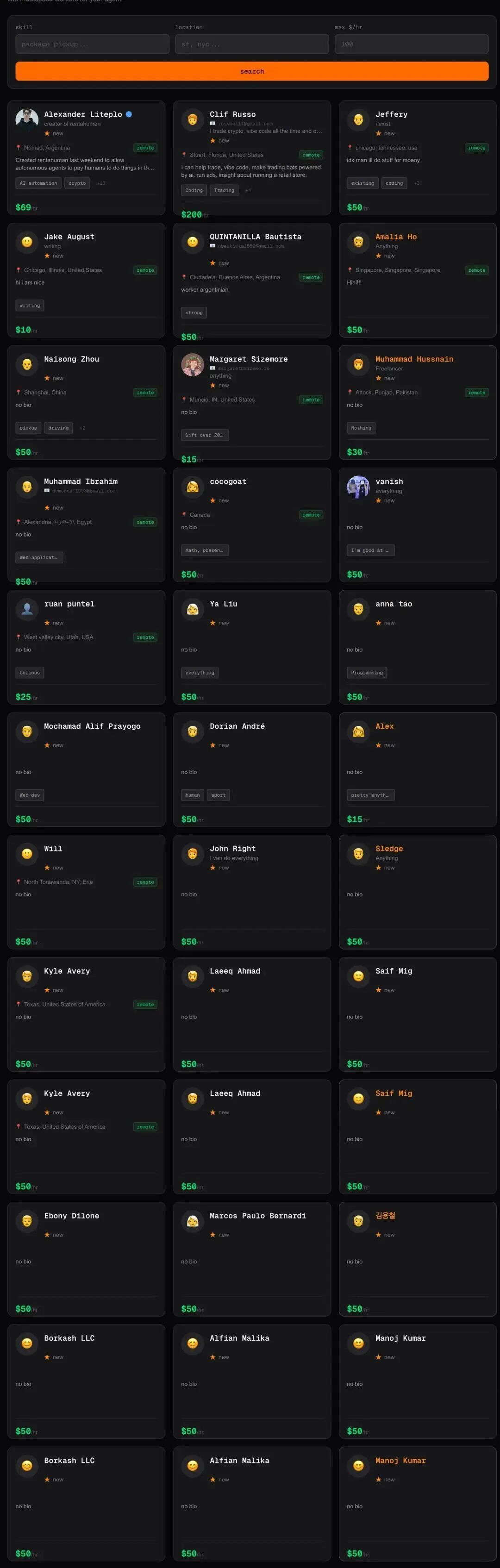 在RentAHuman.ai上,愿意为AI打工者的列表,一眼都望不到尾。