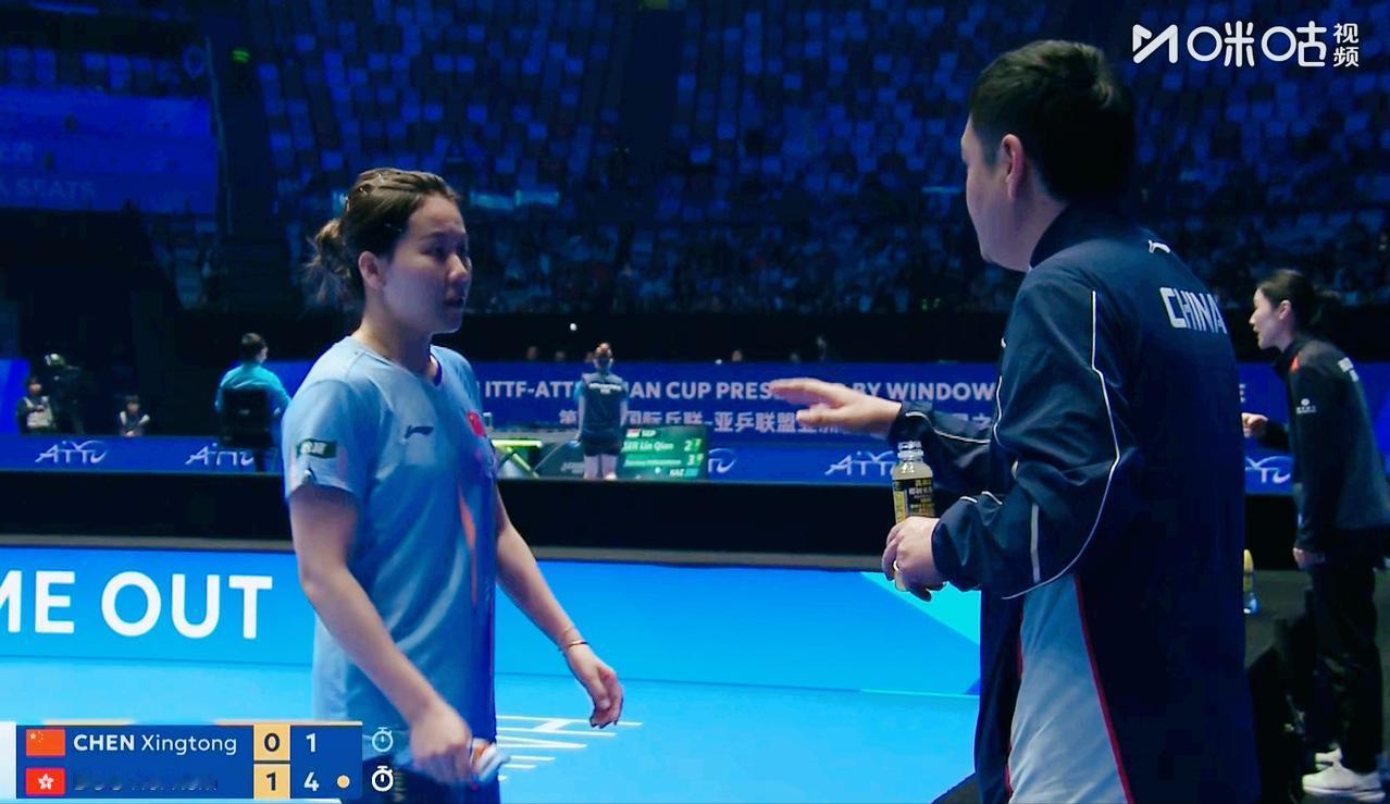 警惕!这次海口亚洲杯, 裁判指导球员, 怎么都被收声了? 这样咱们国乒的秘密不都泄露了吗? 陈幸同和杜凯琹这场, 还是邱贻可做现场指导, 我听到同同也在抱怨, 杜凯琹拼的真凶。 第一局陈幸同 7:11输了。 第二局陈幸同1:4开局后叫了暂停。 我听同同有些着急, 不断地说前三板打的不顺, 邱贻可提醒她, 不要被杜凯琹的搏杀影响了情绪, 你按照原先战术打就行。 结果回来同同就7:5反超了, 只要不影响心态, 肯定能赢杜姐, 因为两人十战, 同同全胜。