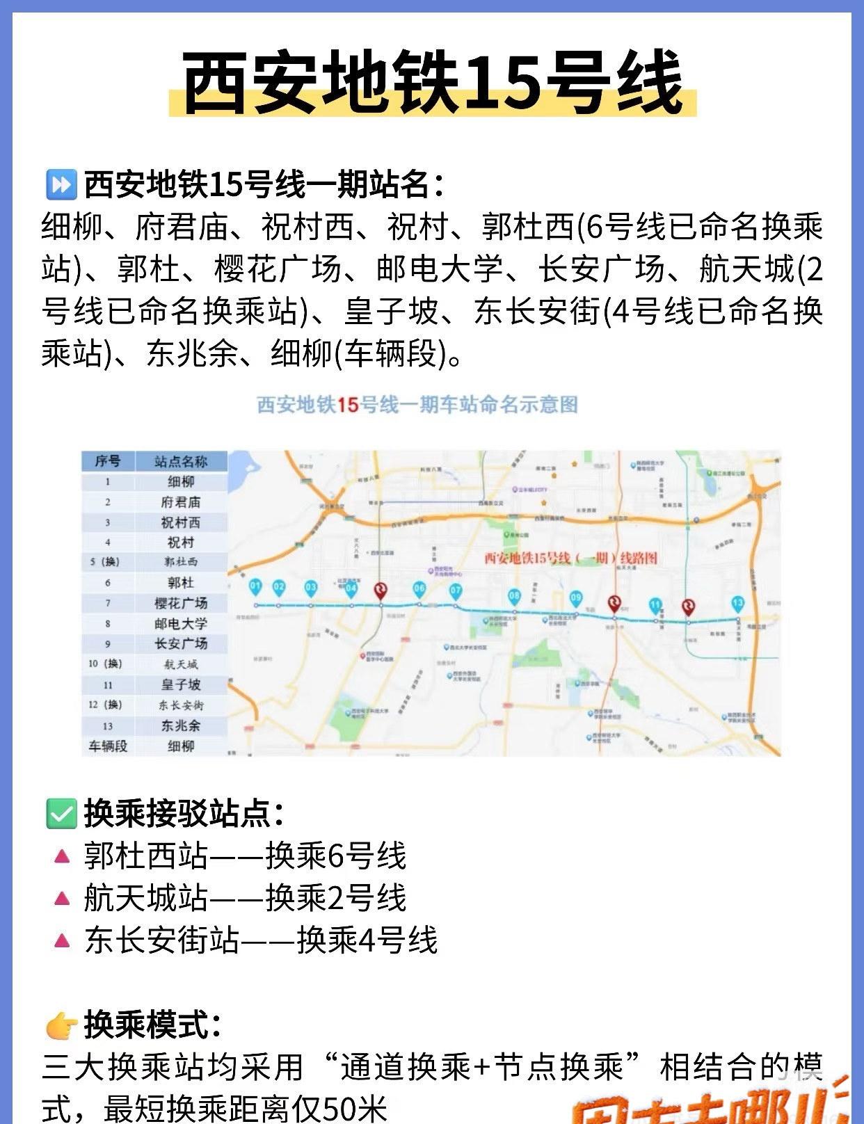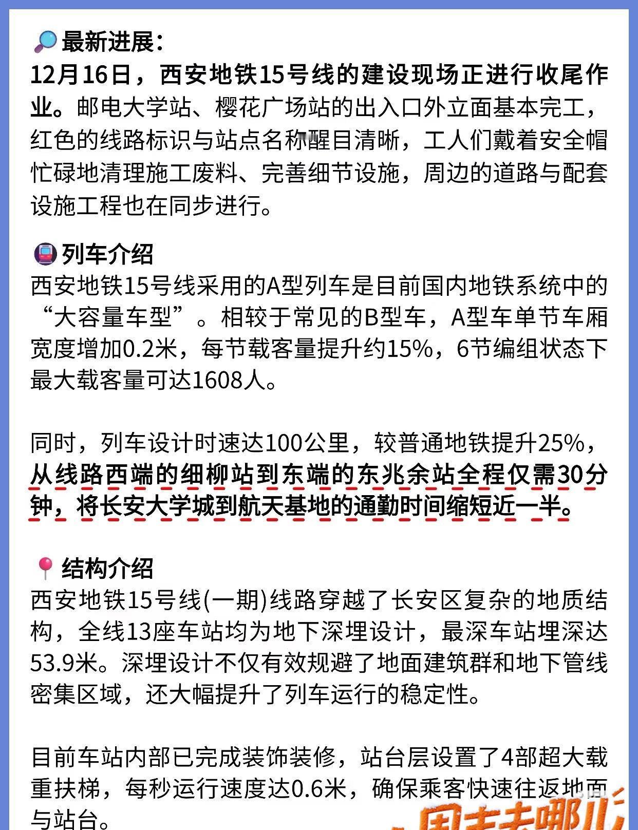 西安地铁15号线(一期)开启试运行 📍西安 0元玩转这座城 12月23日,西安地铁15号线(一期)开启试运行,12月26日将正式开通!这条城南“科创动脉”西起细柳站,东至东兆余站,全长19.4公里,设13座地下车站。 线路串联高新、长安、航天三大区域,3座换乘站最短换乘仅50米,无缝衔接2、4、6号线。采用GOA4级无人驾驶,时速100公里,全程30分钟直达,通勤效率大幅提升。列车以“缤纷红”为主色调,站点设计融合古韵与科技,邮电大学站还有红色通信记忆文化长廊。 作为三期规划收官之作,它不仅方便200余万市民出行,更联动高校与产业园,为城南发展注入新动能! 城市向导官 航天员 地铁口 开往春天的列车 地铁游 地铁 地铁观察员日记 坐地铁 航空航天