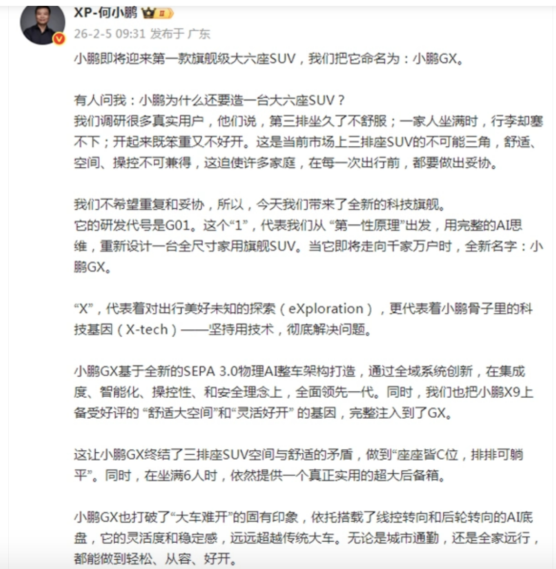何小鹏官宣大六座SUV命名为:小鹏GX。
