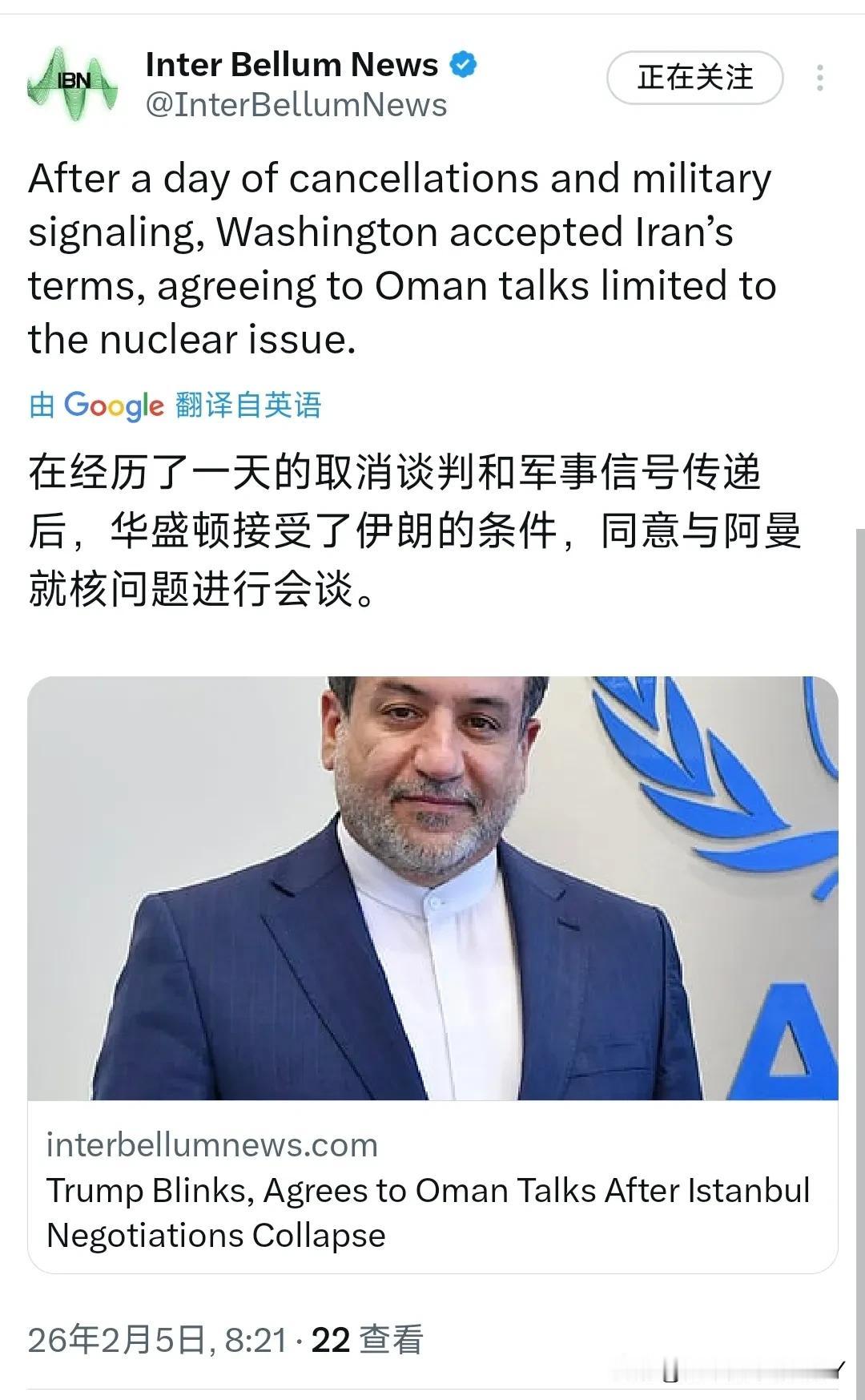 一场战争在所难免!2月5日,Axios爆出消息:美伊谈判彻底崩盘。不是谈不拢,而是根本没谈成——伊朗拒绝了美国开出的条件,美国随即撂下一句“那就什么都不做”,转身让特使史蒂夫·威特科夫收拾行李,明日就从中东打道回府。 这场本该在周五举行的会谈,还没开场就已落幕。表面看是地点之争、议题之分歧,实则是一场赤裸裸的最后通牒:你要么按我的规矩来,要么滚蛋。 美国要求把谈判地点从阿曼挪回伊斯坦布尔,还要把伊朗的导弹计划纳入议程。伊朗却坚持只谈核问题,且必须在中立国阿曼进行。双方各执一词,谁也不退半步。 可细品美方那句“我们没想到伊朗人会拒绝”,是不是透着一股居高临下的傲慢?仿佛全世界都该围着华盛顿的指挥棒转,稍有不从,就是“不识抬举”。这种心态,早已不是外交,而是胁迫。 谈判破裂之后,战争真的不可避免了吗?有人急着喊打,说伊朗唯有亮剑才能活命;有人说加沙的惨状就是前车之鉴——投降是死,不投降也是死,不如拼一把。 这话听着悲壮,却也折射出弱者的无奈。可问题是,伊朗真是弱者吗?它坐拥中东战略要地,手握导弹与区域影响力,背后还有俄罗斯这个军火库。若真被逼到墙角,难道只能束手就擒? 伊朗何与其在谈判桌上被步步紧逼,不如先筑牢自己的盾牌。买武器、练兵、强化防空系统,哪怕牺牲短期利益,也要保住长期安全。毕竟,没有枪杆子的外交,不过是纸上谈兵。 美国把导弹问题塞进谈判,用心昭然若揭。它真正害怕的,从来不是伊朗有没有核弹,而是伊朗能不能用导弹把美军基地、以色列城市乃至欧洲目标纳入打击范围。 一旦伊朗具备这种能力,美国在中东的霸权就不再牢不可破。所以,它要趁早掐断这条线。可伊朗若真答应放弃导弹,等于自断臂膀。今天交出导弹,明天就得交出主权。 历史一再证明,强权从不满足于一次让步,它只会得寸进尺。有人幻想通过妥协换取和平,殊不知在霸权逻辑里,退让只会换来更多羞辱。 当年伊拉克销毁大规模杀伤性武器,结果换来的是入侵与政权更迭;利比亚弃核,换来的是内战与国家分裂。前车之覆,后车之鉴。伊朗若天真地以为“配合就能过关”,恐怕结局比加沙还惨。 加沙至少还在抵抗,而投降的政权,连抵抗的资格都没有。 那么,伊朗该怎么办?坐等挨打?显然不行。全面开战?风险太大。但有一条中间道路:以战促和,以实力求尊严。 立即加强与俄的军事合作,采购先进防空系统、远程打击武器,甚至探讨联合演习的可能性。这不是挑衅,而是自保。你越有底气,对方越不敢轻举妄动。美国最怕的,从来不是一个愤怒的伊朗,而是一个武装到牙齿、意志坚定、盟友坚实的伊朗。 当然,战争绝非首选。但准备战争,却是避免战争的最佳方式。美国之所以敢频频施压,正是吃准了某些国家“不敢打”的心理。一旦伊朗展现出“宁为玉碎”的姿态,华盛顿反而会掂量代价。 毕竟,一场中东大战,对谁都没好处。油价飙升、全球供应链断裂、美军深陷泥潭……这些都不是拜登政府愿意看到的。所以,伊朗此刻最需要的,不是慌乱投降,也不是盲目冲锋,而是冷静布局。 一边加速军事现代化,一边争取外交支持,同时向国内民众传递清晰信号:我们不愿战,但绝不惧战。这种姿态,既是对内凝聚民心,也是对外释放威慑。真正的和平,从来不是乞求来的,而是用实力捍卫来的。 反观美国,嘴上说着“仍愿谈判”,行动却充满威胁。它一边撤走特使,一边在波斯湾增派军舰,这哪是诚意?分明是“边打边谈”的老套路。可这套把戏玩多了,别人也会免疫。伊朗若继续被动应对,只会被牵着鼻子走。 不如主动出牌,试射新型导弹、深化与真主党合作。用行动告诉世界:我们的底线不容试探。有人说,这样会激化矛盾。可矛盾早已存在,只是被暂时掩盖。美国的目标从来不是“管控分歧”,而是“改变政权”。 只要伊朗不变成亲美附庸,制裁与围堵就不会停止。既然如此,何必委屈求全?不如挺直腰杆,把命运攥在自己手里。正如一句中东谚语所说:“骆驼跪下,是为了更好地站起来。” 现在的伊朗站在十字路口:是继续幻想西方的仁慈,还是觉醒于现实的残酷?答案其实早已写在历史里。萨达姆选择了妥协,结果身首异处;卡扎菲选择了投降,结果惨死街头。 这不是鼓吹战争,而是揭示一个冷酷真相:在强权面前,软弱换不来怜悯,唯有力量才能赢得尊重。伊朗若想活出尊严,就必须放弃“以柔克刚”的幻想,转而信奉“以刚制刚”的现实主义。武器不是万能的,但没有武器是万万不能的。 今日多造一枚导弹,明日就少一分屈辱。因为真正的和平,永远属于敢于捍卫自己的人。