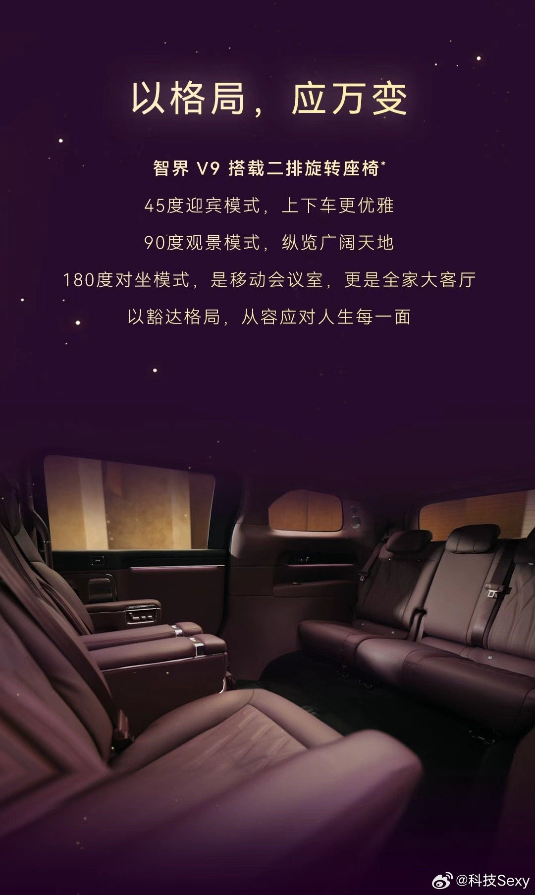 入座即是头等舱今年准备买的第一辆MPV就是智界V9智界V9首发绒霞紫内饰,与辉光紫外观共同诠释静奢美学,并搭载二排旋转座椅、太空舒躺模式及零重力座椅模式等智能科技配置,以场景化打造全新用车体验,堪称“MPV科技车皇”。在材质方面,智界V9选用天然实木、NAPPA头层真皮与晶钻切工水晶等高端材质,诠释细腻豪华质感。豪华与科技双重拉满,智界V9的颠覆性产品力已显露“爆款”锋芒,有望彻底激活50万高端MPV市场!余承东官宣智界V9绒霞紫内饰