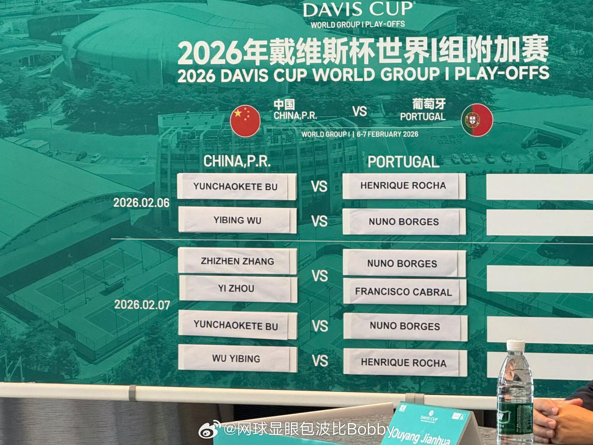 戴维斯杯中国vs葡萄牙对阵出炉🔥⏰2月6日:🇨🇳布云朝克特 vs 罗沙🇨🇳吴易昺 vs 博杰斯