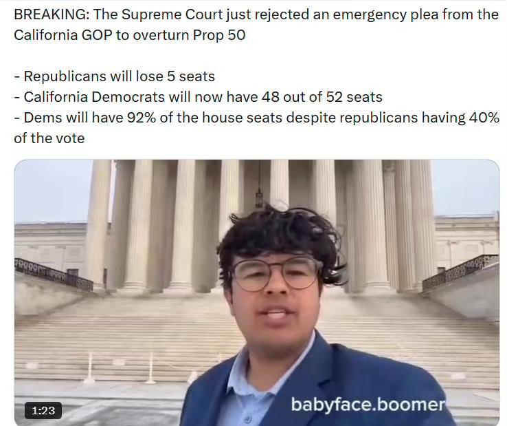 美国最高法院刚刚驳回了加州共和党提出的紧急请求,拒绝推翻第50号提案。 • 共