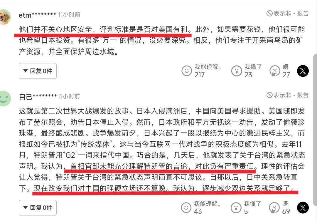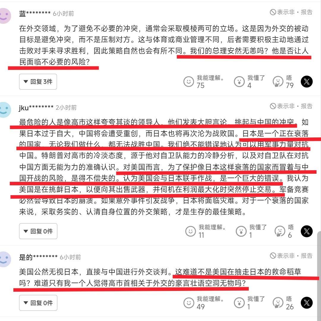 中美通话后,日本舆论突然转向:高市自讨苦吃,让日本陷入危险 当地时间2月5日,几乎所有日本主流媒体,都在显著位置报道了中美元首在前一天的通话。这些报道虽然侧重点不一,但基本都强调了特朗普表态中的三个重点: 第一,他重视中方在台湾问题上的关切,愿同中方保持沟通。 第二,他非常期待4月的访华之旅。 第三,他相信,未来三年将有一系列与中国有关的积极成果不断涌现。 虽然特朗普并没有在“一个中国”原则上做出直接回应,但整体来看,特朗普对中美关系的看法还是积极的、正面的。也正是这样的表态,让日本人彻底坐不住了。 在日本右翼聚集的雅虎新闻网站评论区,留言的舆论风向突然有了180°的大转弯,从一个月前对中国喊打喊杀,变成了对高市早苗的强烈声讨。 有人就指出,虽然特朗普没说“美国奉行一个中国原则”,但他说重视中方的关切,就是默认了台湾是中国的一部分,台湾问题是中国内政。这也就意味着,高市早苗的挑衅站不住脚,反而是中方的 抗议才有理有据。 还有人称,高市早苗显然错误理解了美国的意思,所以才主动对中国挑衅,结果又被美国抽走了救命稻草,只能落得自讨苦吃的下场。 更有人毫不客气地说,对于日本来说,最危险的就是像高市这样只会夸夸其谈的领导人,因为日本正走向衰落,无论如何也赢不了中国,高市却还要执意挑衅,让日本陷入了危险之中。 显然,日本右翼也看出了风向的不对——美国正试图稳定对华关系,日本要是执意冲在最前面挑事,很可能里外不是人,而一旦日本失去美国的明确支持,处境将非常被动。更直白点说,特朗普越是对访华表现出兴趣,东京有些人心里就越发毛,生怕自己成了大国关系缓和时被放弃的那个筹码。 当然,对特朗普,我们还需要继续听其言观其行,毕竟,他所谓“重视中方关切”,并不代表尊重中方立场,“保持沟通”也不代表停止挑衅,但至少可以肯定的是,对于迫切想要在大选中拿下胜利的高市早苗来说,中美的这通电话,绝对是一个噩耗。
