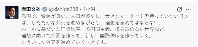 *2月4日,日本前首相岸田文雄发文:“日本是一个岛国,资源匮乏、人口不断减少,也没有庞大的本土市场。在推行务实外交的同时,我们绝不能忘却理想追求:基于规则的国际秩序、多边主义、无核武器世界等。我们要为实现这些理想结交伙伴,携手构建全新的国际秩序,日本理应推进这样的外交路线。” 这段话说得挺“高大上”,又是理想又是新秩序,但说白了,核心就是日本这个岛国的生存焦虑,毕竟老天爷没给啥先天优势,日子过得确实有顾虑。 咱们先掰扯掰扯它的现实难题:日本战略资源高度依赖进口:石油、天然气消费基本依赖进口(石油自给率不足 0.1%),能源综合自给率约 12%,木材自给率约 20%,大部分都得从国外买。 更让人头疼的是人口,连续16年一直在减,光2024到2025这一年就少了90多万人,创下几十年的新高,估计今年就得跌破1.2亿人。 而且老人越来越多,65岁以上的快占三成了,能干活的人越来越少。 本土市场也小,自己人消化不了多少东西,只能靠往外卖,2024年进出口总额看着不少,但进口比出口还多,完全离不开外部市场。 所以岸田说的“务实外交”,其实就是没法子的现实选择,不跟别人搞好关系,资源进不来、商品卖不出去,日子真没法过。 再看他提的那些“理想追求”,看着挺有情怀,其实每一个都藏着实实在在的算盘。 先说“基于规则的国际秩序”,官方文件里说得很清楚,就是想跟G7那些盟友,还有更多国家拉近距离,一起定规矩、搞合作,避免世界分成好几派对着干。 这背后其实是日本在搞“抱团取暖”:经济上,他们主导的那个CPTPP 现有 12 个成员国(含 2024 年 12 月加入的英国),覆盖约 5.8 亿人口,GDP 总量约占全球 13%,贸易额约占全球 15%,英国去年12月也加进来了,还有不少国家在排队。 通过这个协议,日本的汽车、电子零件这些优势产品,能更方便地卖到别的国家。 安全上,跟美国、印度、澳大利亚搞的QUAD机制,还有美日同盟,都是为了让自己的海上运输线更安全,毕竟它的资源都靠海运,这条线断了可就麻烦了。 说白了,这个“规则”就是日本想出来的“护身符”,为了让自己的生存环境更稳定。 至于“多边主义”,对日本来说就是“打开市场的钥匙”,不管是CPTPP还是RCEP,这些自贸协定能让日本的产品少交很多关税,轻松走进更多国家的市场,刚好弥补本土市场小的短板。 数据显示,CPTPP 为日本汽车、电子等优势产业提供了更广阔市场准入,促进了出口增长,在人口减少、就业难的当下,这可是实打实的好处。 而且日本还主动当“协调员”,帮着英国加入CPTPP,就是想拉更多国家进来,人多规矩就好推行,自己的影响力也能变大,相当于“以规则交朋友,以朋友扩市场”,算盘打得很精。 还有“无核武器世界”,这事儿确实带着日本的特殊历史印记。 作为唯一一个挨过核打击的国家,提无核世界既有真情实感,也想靠这份“历史悲情”提升自己在国际上的话语权,比如把G7峰会放在广岛开,就是想让全世界关注核裁军。 但背后也有现实考量:它得靠美国的核保护伞保护自己;又怕周边出现核扩散,威胁到自己的能源运输线和安全环境。 所以它的无核主张,重点不是彻底放弃核威慑,而是希望大家都别用核武器,把核裁军变成规矩,既不得罪美国,又能彰显自己的“道德立场”,一举两得。 不过,日本想靠“理想+伙伴”构建新秩序,可不是件容易事,麻烦还不少。 比如它一边说要搞务实外交,一边又年年增加防卫预算,还在发展远程导弹,打破了之前的武器出口限制,这就有点自相矛盾了,周边国家肯定会担心它是不是要搞“再军事化”,自然很难完全信任它。 还有历史问题,不少国家对日本的历史认知有分歧,这也让它想拉的“价值观同盟”很难真正一条心。 另外,很多发展中国家对“基于规则的国际秩序”理解不一样,人家更看重国家主权平等,不想被别人干涉内政,这跟日本跟着西方的立场不太合拍,想拉拢这些国家,还得解决利益分配的问题,没那么简单。 岸田的这些外交主张,本质上就是日本在“先天不足”和世界格局变化之间找平衡:用“务实”解决资源、人口、市场的生存难题,用“理想”装点门面、争取话语权,再用“交朋友”把这两样落到实处。