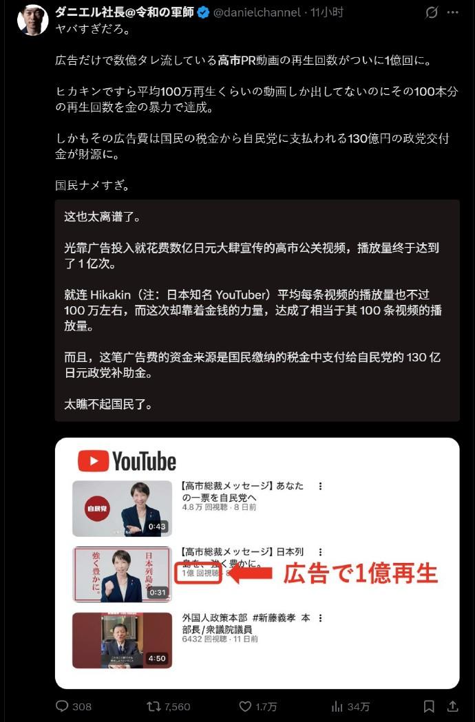 选举变饭圈打榜?高市早苗刷数据翻车 说高市早苗选举是玩饭圈打榜,还真不是冤枉她。 日前,高市早苗一则给自民党拉票的宣传广告,引发了日本网友质疑。高市早苗演技派 简单来说,就是高市团队给这则宣传广告刷播放量刷过头了,短短几天内播放量居然达到了1亿次,但点赞只有几万个,数据明显不正常。 所以,现在日本网友纷纷追问,高市团队和自民党为这支广告的投放花了多少钱,并质疑自民党肆意挥霍纳税人的税款。 事实上,高市早苗在选举中玩饭圈刷数据已经不是一次两次了。她担任首相之初,日本社交媒体就曾被大量马屁式评论刷屏,无一例外都是在称赞高市早苗作为女性担任首相有多么厉害、有多么不容易,诸如什么“守护最好的高市早苗”“高市超厉害”“日本终于有救了”等等,与正常网友的评论格格不入,明显就是网络水军批量复制粘贴的应援文案。 而高市本人也有意识地推动这种饭圈政治。像这次她解散众议院的理由,就是为了所谓的“向国民询问自己是否适合继续担任首相”——与政治因素没有任何关系,纯粹是对自己支持者忠诚度的一次大型测试,这种把国家最高权力当作“人气投票”的操作,本身就透露出浓厚的饭圈思维,其实质就是构筑信息茧房。 所以,这则引发日本网友质疑的宣传广告,不过是饭圈政治积累的必然结果:当选举变成打榜刷数据,最终剩下的只有泡沫和质疑。