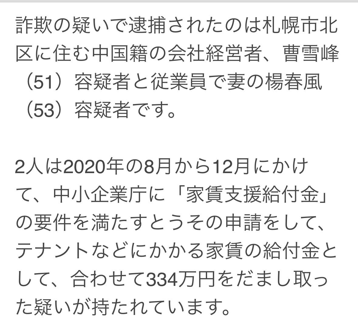 一对中国夫妇虚假申请《房租支援给付金》,骗房租补贴334万日元而被逮捕。 北海道札幌市北区在住,会社经营者曹某及妻杨某,2020年8月至12月期间,向中小企业厅申请房租补贴,共获六份房租合同补贴,其中至少两份是虚假申报。 警方还在调查其余合同是否也存在虚假申报。