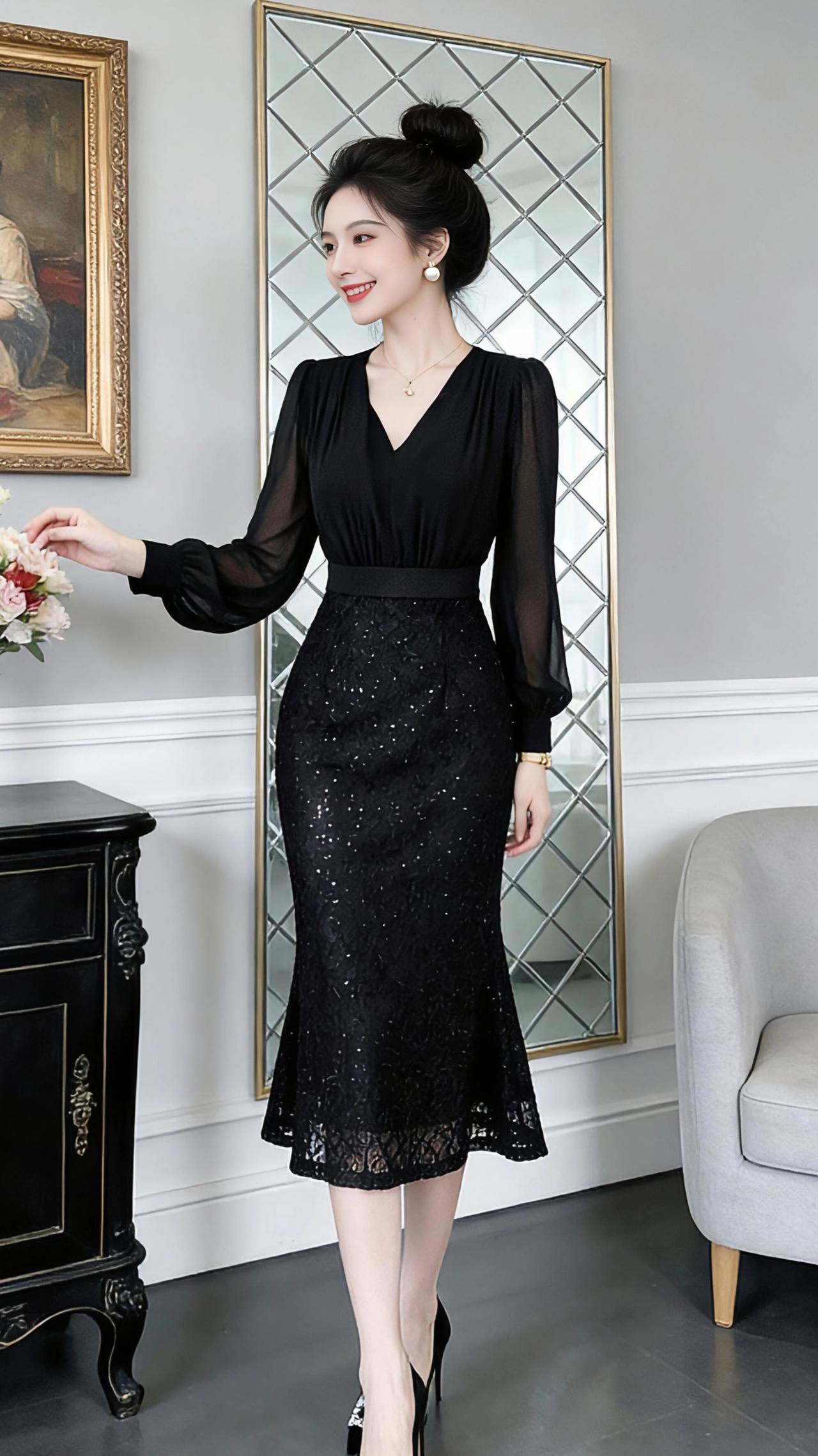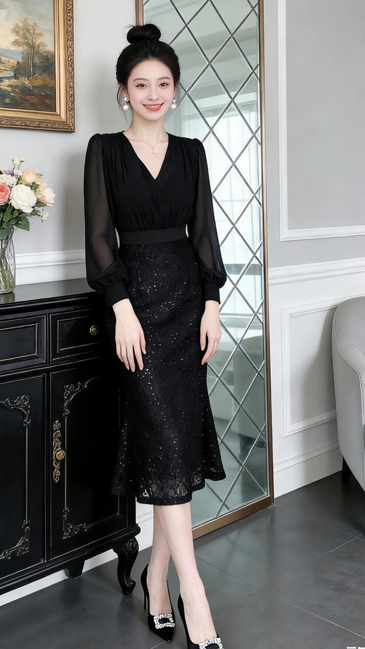 黑裙序章 在浅灰墙面与鎏金镜框勾勒的空间里,她是一袭流动的夜色。 V领收束出天鹅颈的弧度,雪纺袖笼着细碎的光,随抬手的动作轻晃,像揉皱的黑纱漫过腕骨。腰间一道利落的分割,将上半身的柔滑与下半裙的璀璨衔接得天衣无缝——蕾丝底布上嵌满星子似的银闪,每一步都碾落细碎的光斑,鱼尾裙摆扫过哑光地砖,漾开涟漪般的褶皱。 她倚着描金立柜时,裙身的亮片与柜门上的卷草纹遥遥呼应;指尖轻触花瓶里的玫瑰时,雪纺袖与花瓣一同舒展;落座在浅灰沙发上,裙摆垂落如凝固的波浪,黑缎高跟鞋上的水钻扣,是整身黑夜里最剔透的星。 丸子头挽起所有温柔,只留耳坠的珍珠在笑靥旁轻颤。这不是刻意的盛装,而是一场与日常的优雅对谈——黑裙是她的注脚,在明暗交错的房间里,把每一个瞬间都写成了诗。 高级感穿搭新年穿搭冬季穿搭时尚连衣裙