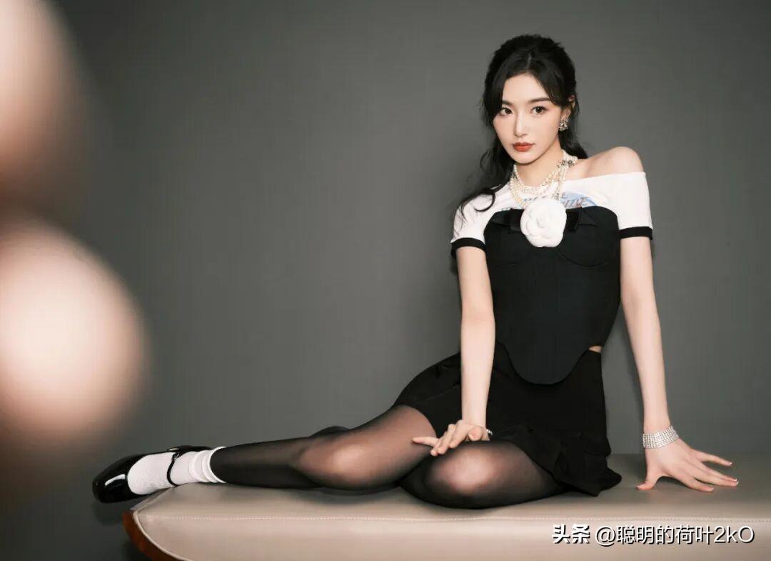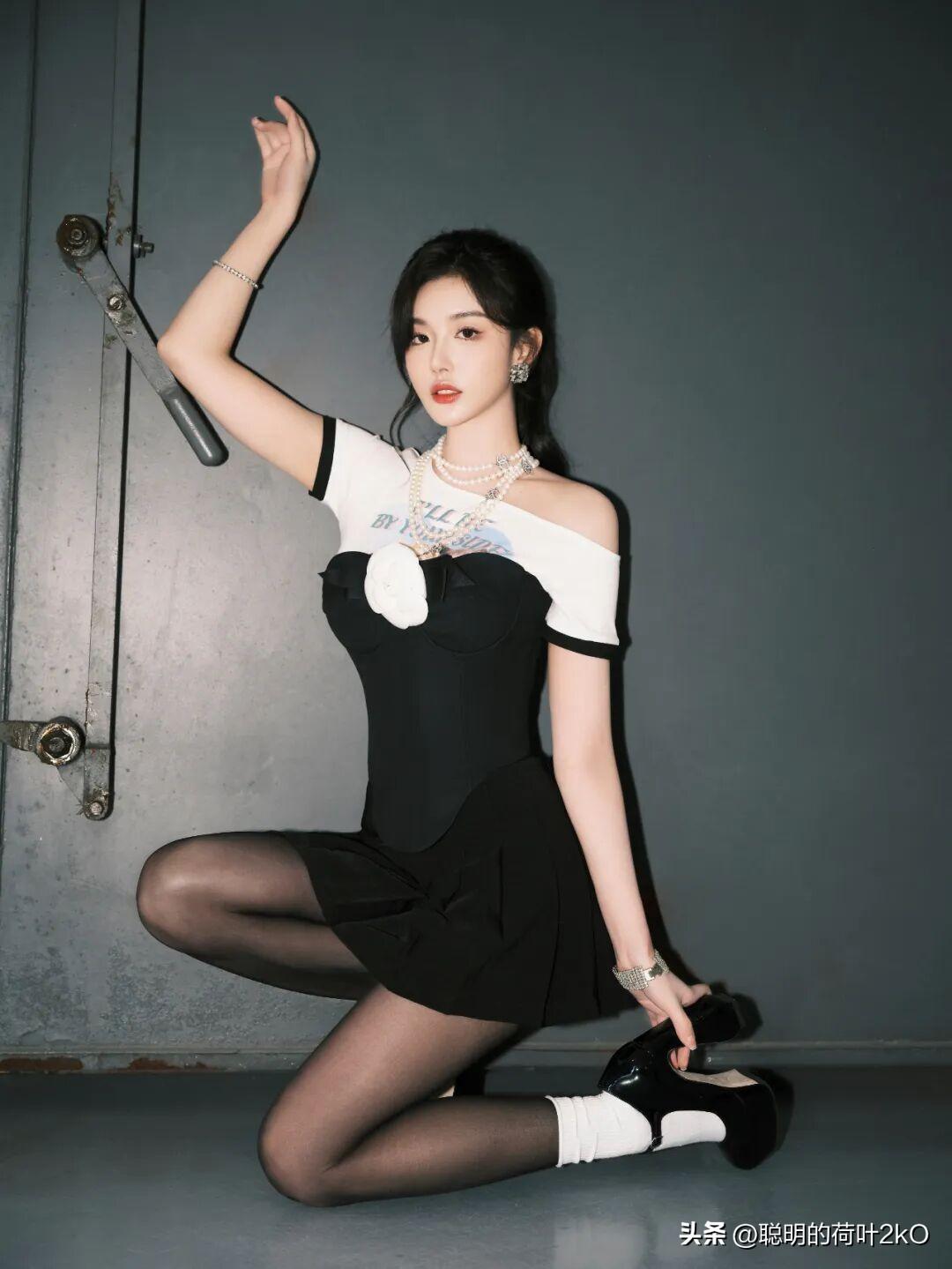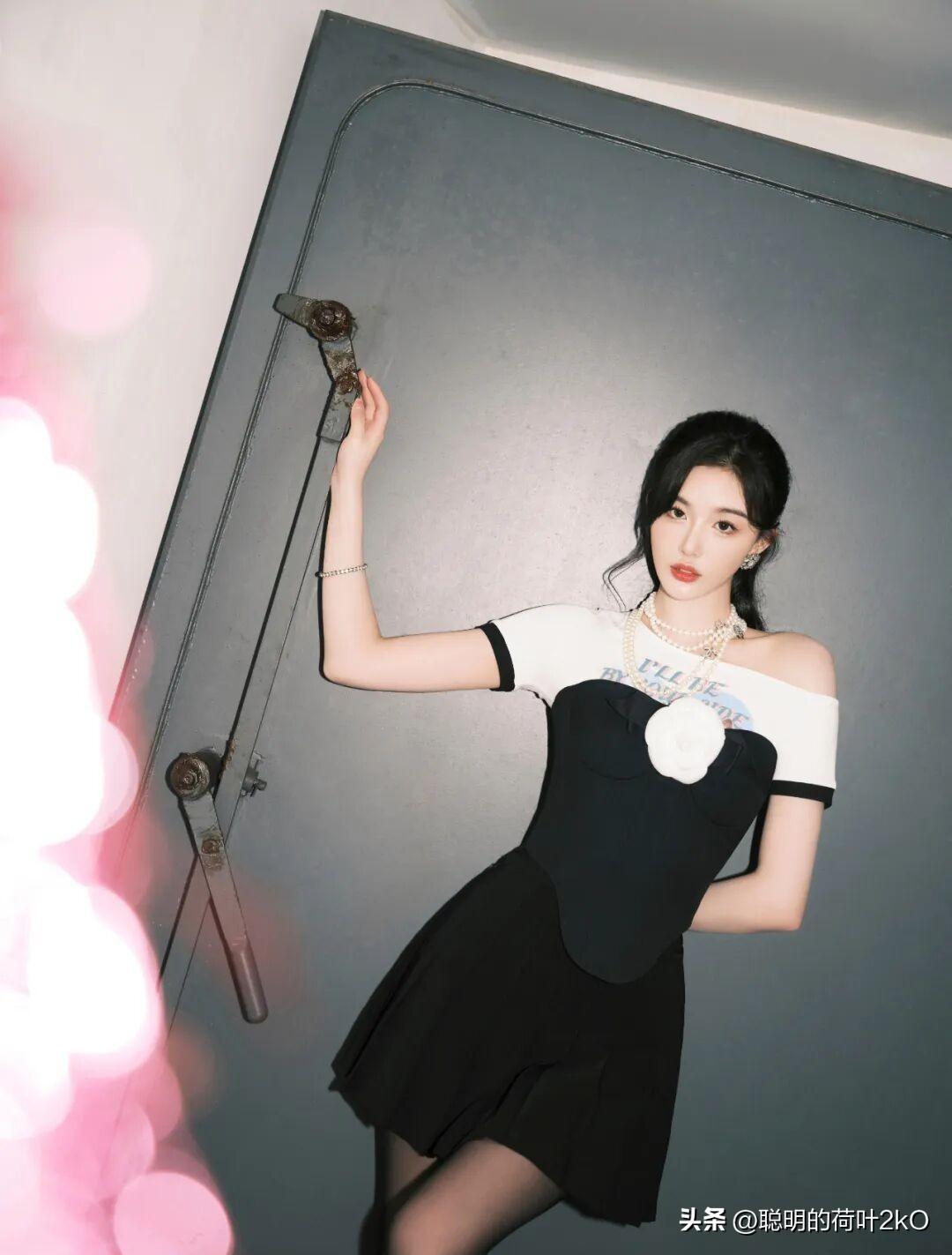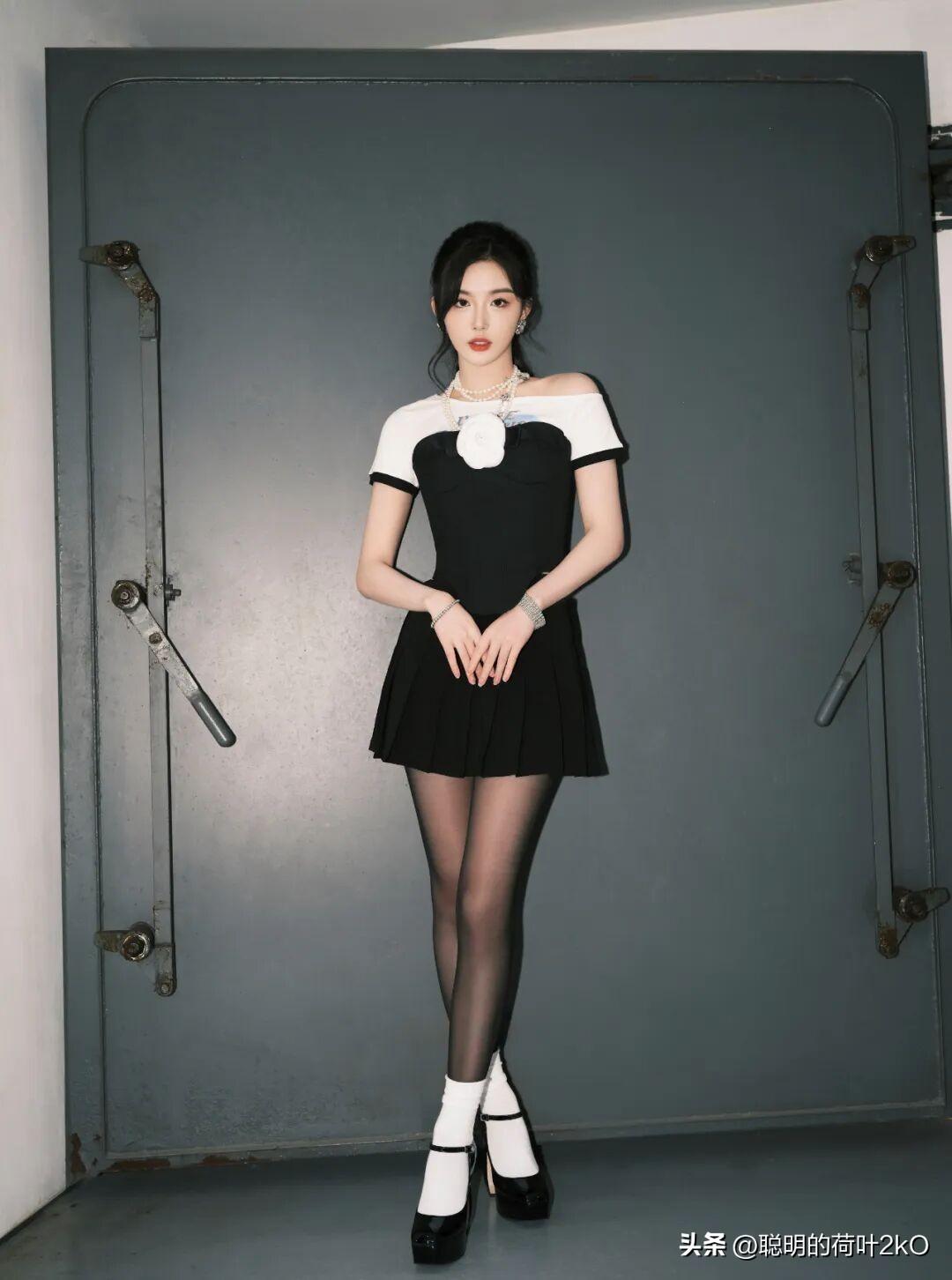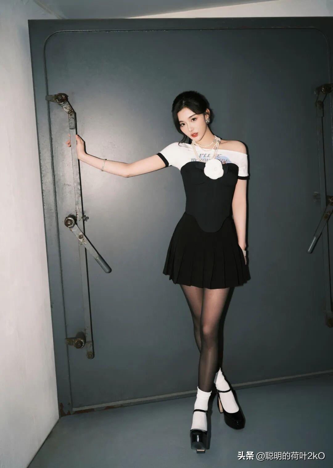 孔雪儿这身黑白撞色穿搭也太有复古甜酷那味儿了