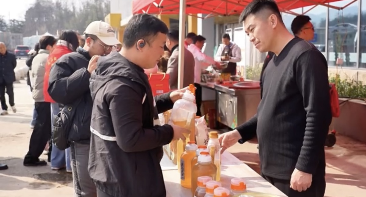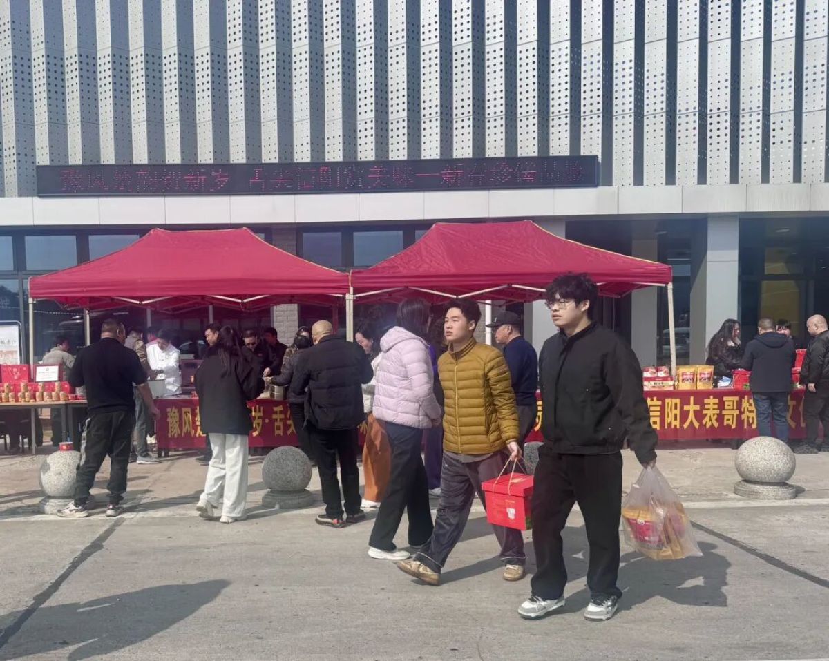 “开饭啦——”活动现场,工作人员一边搅动炖锅、翻炒佳肴,一边向过往旅客热情招呼。焖罐肉、南湾鱼头鱼丸、固始鹅块等信阳经典菜肴整齐摆放在长条桌上,热气蒸腾,浓郁鲜香在空气中蔓延;金丝贡馓、腊鸡、腊排、手工鱼丸等琳琅满目的土特产同步亮相展示区,品类丰富、年味十足。