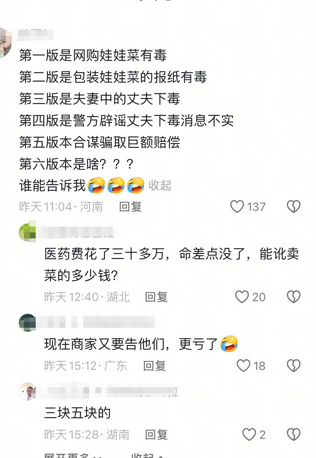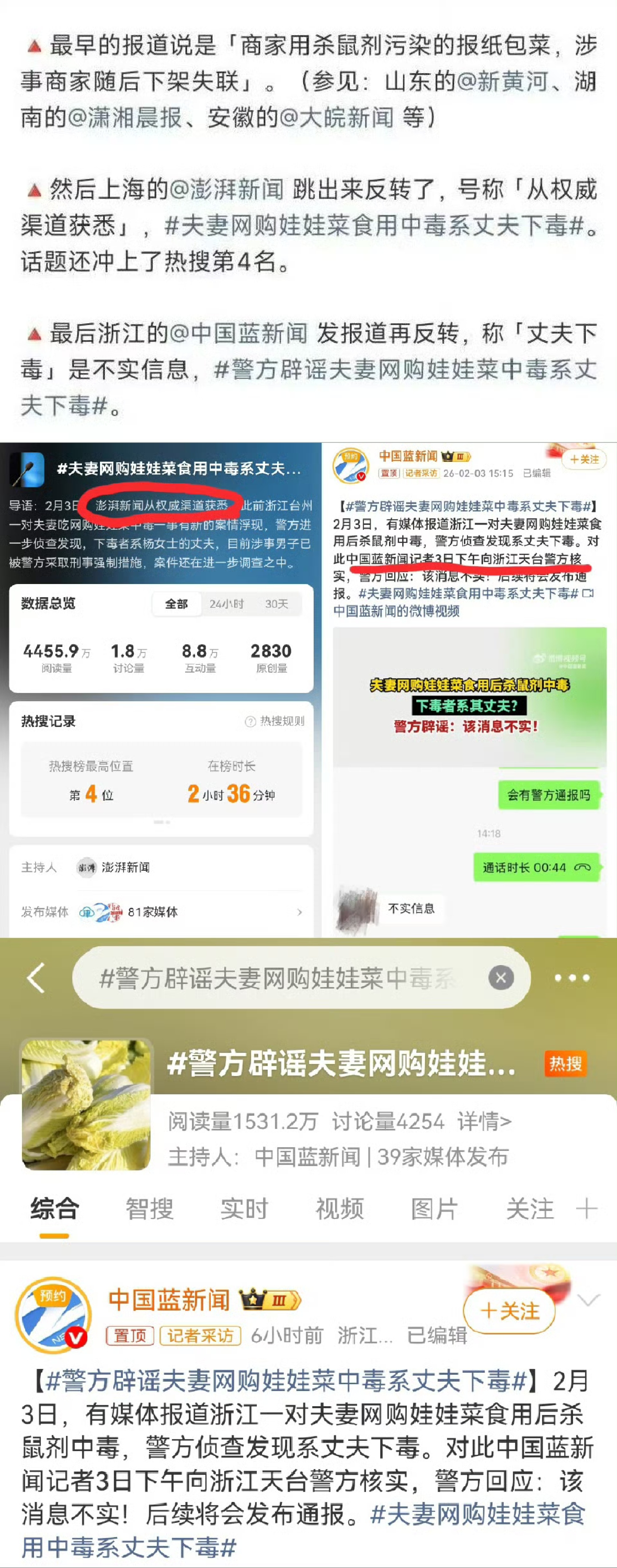 回顾此事件,当警方通报“合谋骗赔”后,相关媒体开始“墙头草”式集体转向,刻意淡化、闭口不谈自身过失,这是当前媒体报道生态的悲哀。当“反转新闻”成为常态,权威媒体报道不再是舆论场的“定海神针”,公众情绪习惯了“狼来了”,转而滋生各种阴谋论,会进一步加剧舆论场的混乱。娃娃菜中毒夫妻公司以二人名字命名
