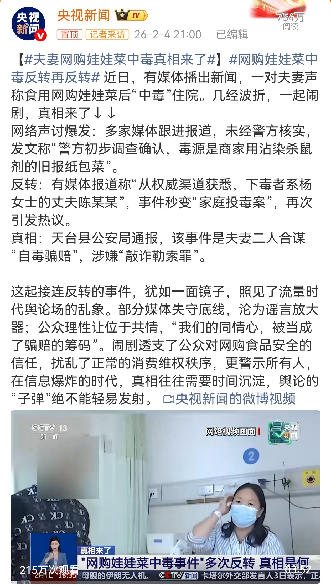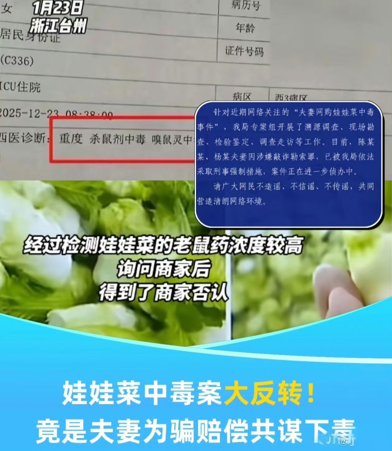 近期,夫妻网购娃娃菜中毒事件,持续反转再反转,评论称“部分媒体失守底线,沦为谣言放大器”。目前,警方通报显示,所谓“中毒”是夫妻二人共谋自导自演,故意在烹饪时添加鼠药后食用,目的是制造中毒假象,向平台和商家索要巨额赔偿。娃娃菜中毒夫妻公司以二人名字命名网购娃娃菜中毒反转再反转