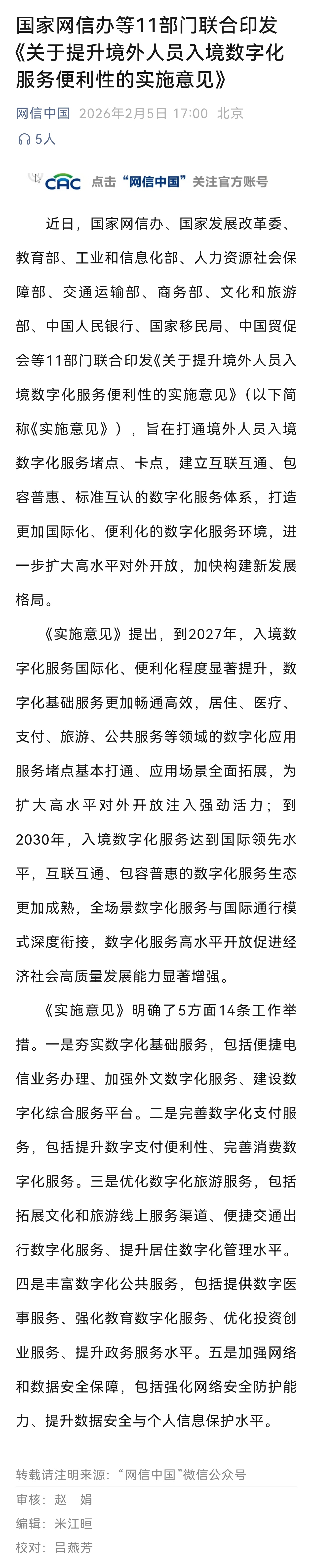 近日,国家网信办等11部门联合印发《关于提升境外人员入境数字化服务便利性的实施意见》, 旨在打通境外人员入境数字化服务堵点、卡点,建立互联互通、包容普惠、标准互认的数字化服务体系,打造更加国际化、便利化的数字化服务环境,进一步扩大高水平对外开放,加快构建新发展格局。时事满谈