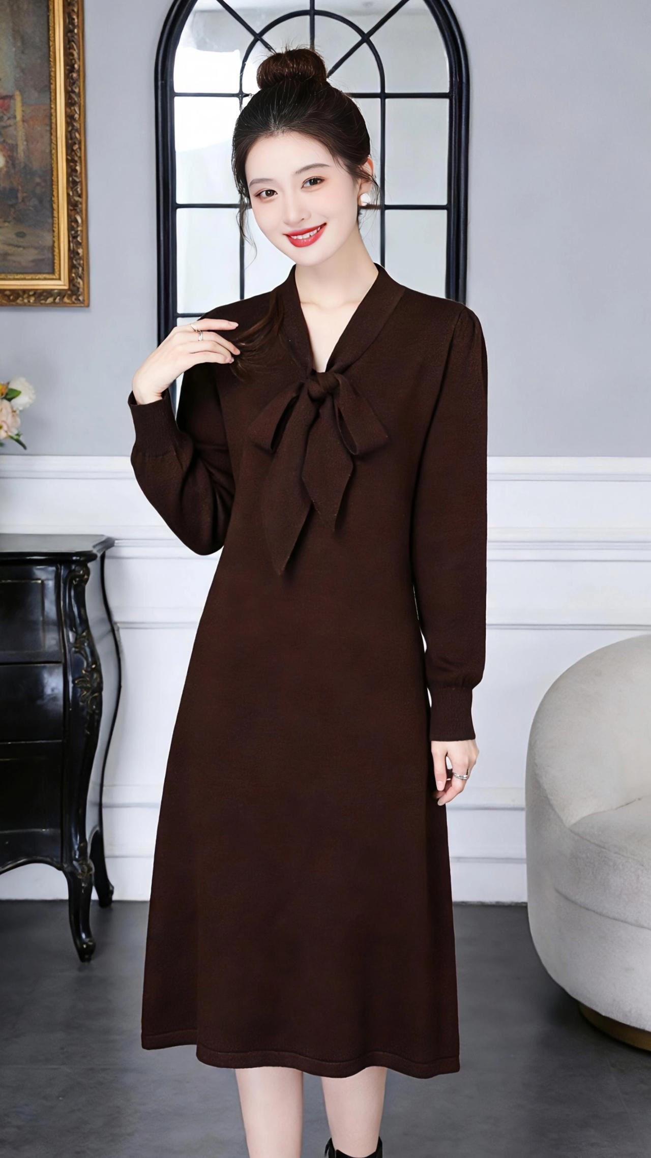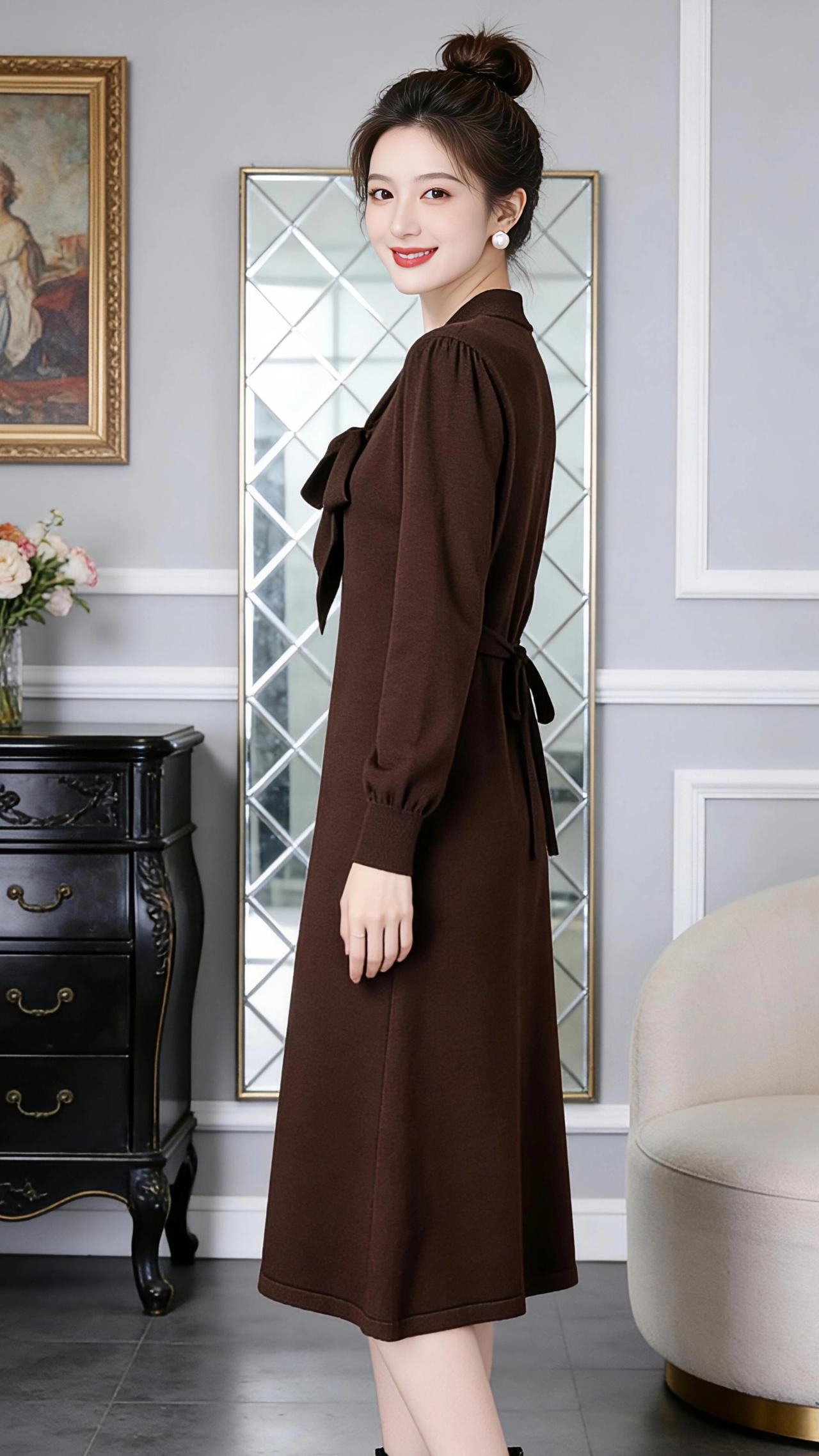 棕裙漫想 深棕的裙摆在浅灰的墙前垂落,像把深秋的焦糖色暖阳裁成了衣袂。领口的蝴蝶结轻轻挽着,似有若无地系住一室温柔,让简约的针织面料里,也漾开了几分雅致的甜。 她倚在雕花的黑柜旁,指尖轻搭着木纹的起伏,身后的油画与花影晕成朦胧的背景。暖棕与冷灰撞出恰到好处的温柔,蓬松的丸子头衬得脖颈线条愈发纤细,珍珠耳坠随着笑意轻晃,是静景里的一抹灵动。 转身时,裙身的弧度如涟漪般散开,背后的系带将腰线轻轻收拢,让宽松的版型多了分含蓄的勾勒。镜面的菱形纹路映着裙角,把这一室的静谧都揉进了织物的纹理里。 这裙装没有繁复的装饰,却以最妥帖的包裹感,让人想起壁炉边的热可可、旧书店里泛黄的扉页,是秋冬独有的松弛与安然。它不是夺目的风景,却是能让人沉下心来的陪伴,如同此刻落在裙上的光线,温软,绵长,且带着岁月沉淀下来的安稳。 高级感穿搭 新年穿搭 时尚连衣裙 穿出自己的风格