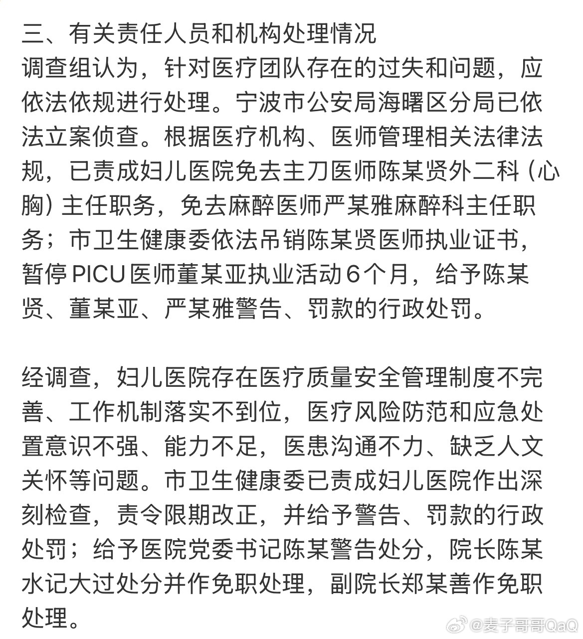 6.术后监测不到位,未及时发现病情变化,处理措施滞后。小洛熙事件最新通报宁波妇儿医院院长被免职小洛熙事件吊销陈某贤医师执业证书小洛熙事件最新通报