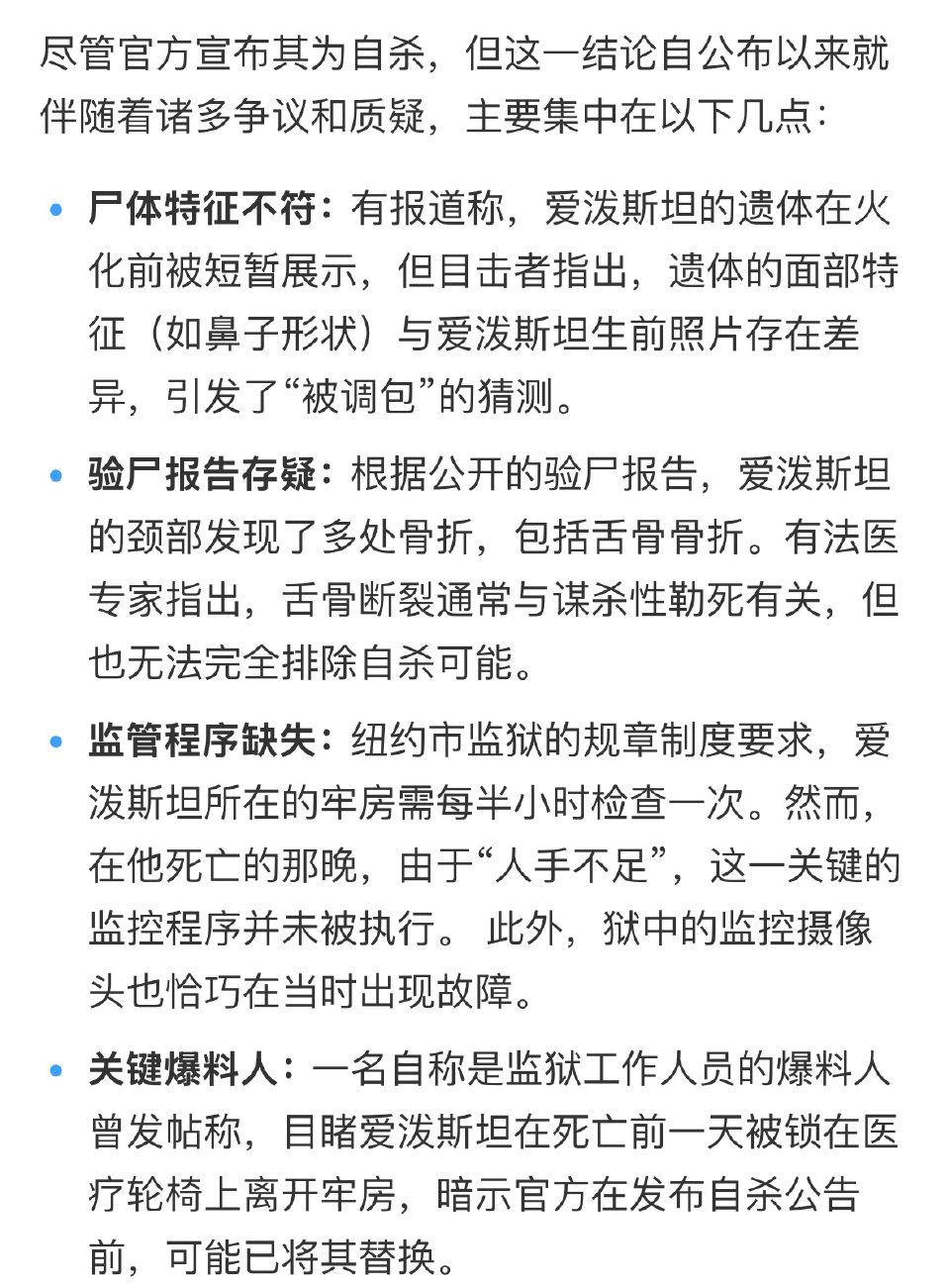 恶魔岛新剧情,爱泼斯坦被掉包了。死者左边胳膊上没有他的纹身,还有,死者的鼻子和爱泼斯坦的也不一样。当年有狱警质疑被掉包,这名狱警后果未知。