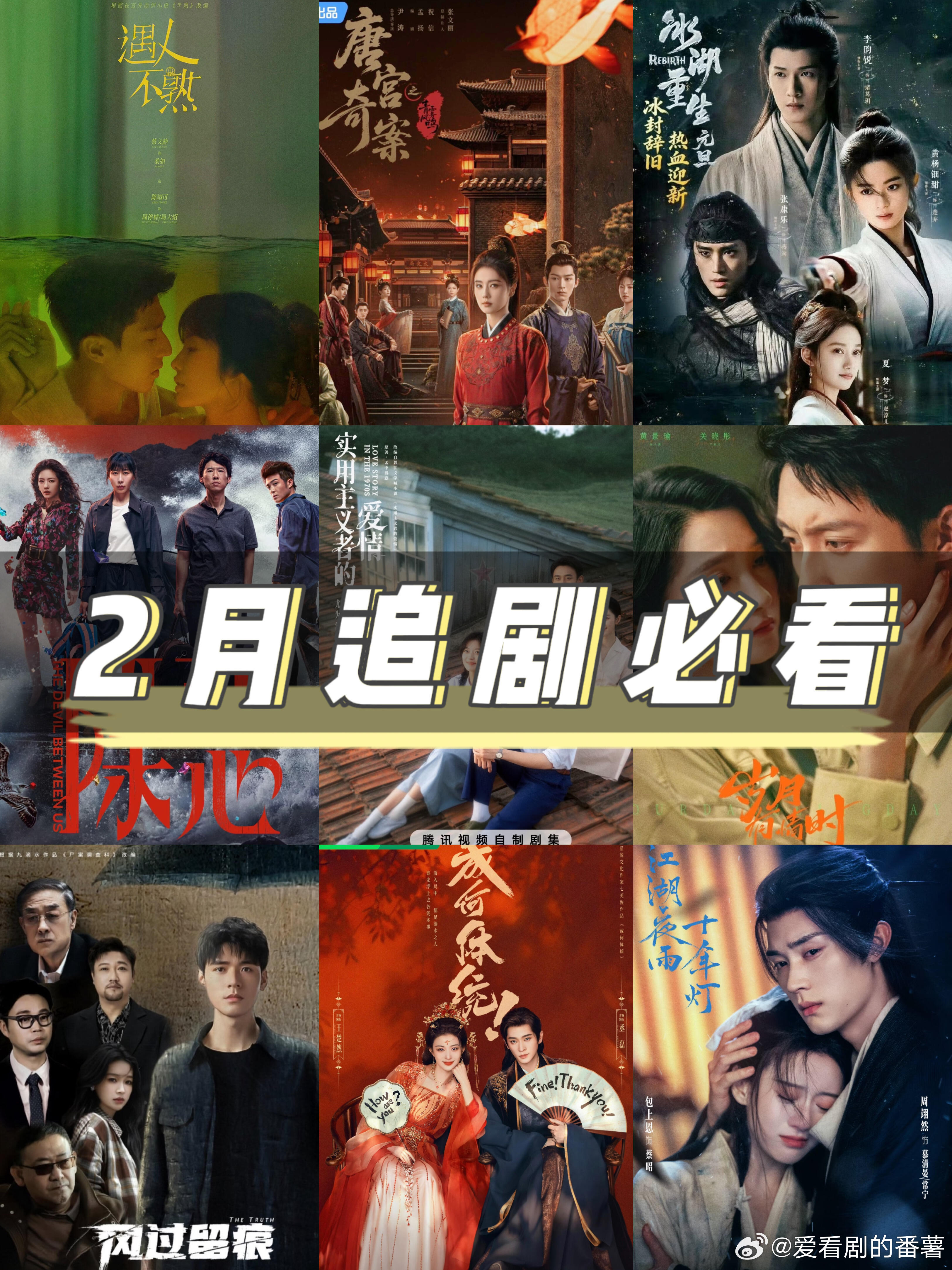 鲨疯啦🆘四大平台‼️新剧来袭🔥2月追剧清单🌷已定档or预计定档酷👖1️⃣2.5《唐宫奇案之青雾风鸣》白鹿 王星越爱🥝1️⃣2.3《风过留痕》龚俊 姜武2️⃣2.6《成何体统》王楚然 丞磊3️⃣2月中《岁月有情时》黄景瑜 关晓彤4️⃣2月中下《夜不收》井柏然 吴幸键5️⃣2月下《除恶》任素汐 王骁6️⃣2月下《遇人不熟》蔡文静 陈靖可腾🐧1️⃣2.3《风过留痕》龚俊 姜武2️⃣2.23《江湖夜雨十年灯》周翊然 包上恩3️⃣2月初《冰湖重生》李昀锐 黄杨钿甜4️⃣2月中下《实用主义者的爱情》陈飞宇 孙千5️⃣2月下《玫瑰丛生》王子文 刘宇宁芒🥭1️⃣2月中《好好的时代》梅婷 田雨——————END——————🌷未定档酷👖《千香》鞠婧祎 宋威龙《势在必行》郭京飞 李乃文《烽影燃梅香》王楚然 李宏毅爱🥝《醒来》欧豪 古力娜扎《主角》张嘉益 刘浩存《佳偶天成》任嘉伦 王鹤润《你好1983》周也 翟潇闻腾🐧《慕胥辞》迪丽热巴 陈飞宇《花开锦绣》丁禹兮 邓恩熙《古乐风华录》李一桐 陈鑫海芒🥭《欢聚》李兰迪 此沙《祯娘传》杨紫 韩东君