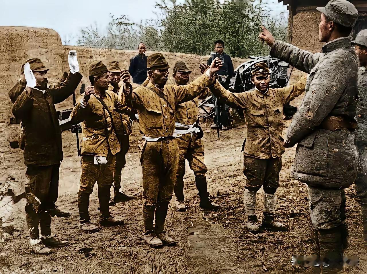 日本鬼子举起了双手,向八路军投降,看看画面中的这些日本鬼子,獐头鼠目,贼眉鼠眼,个头都不高,真像一群来自地狱中的小鬼,老百姓给它们起的这个名字,真是太贴切了,就是这些来自地狱中的小鬼,给我们的国家和人民带来了堪回首的苦难,我们永远不要忘了它们犯下的滔天罪行,铭记历史,勿忘国耻!