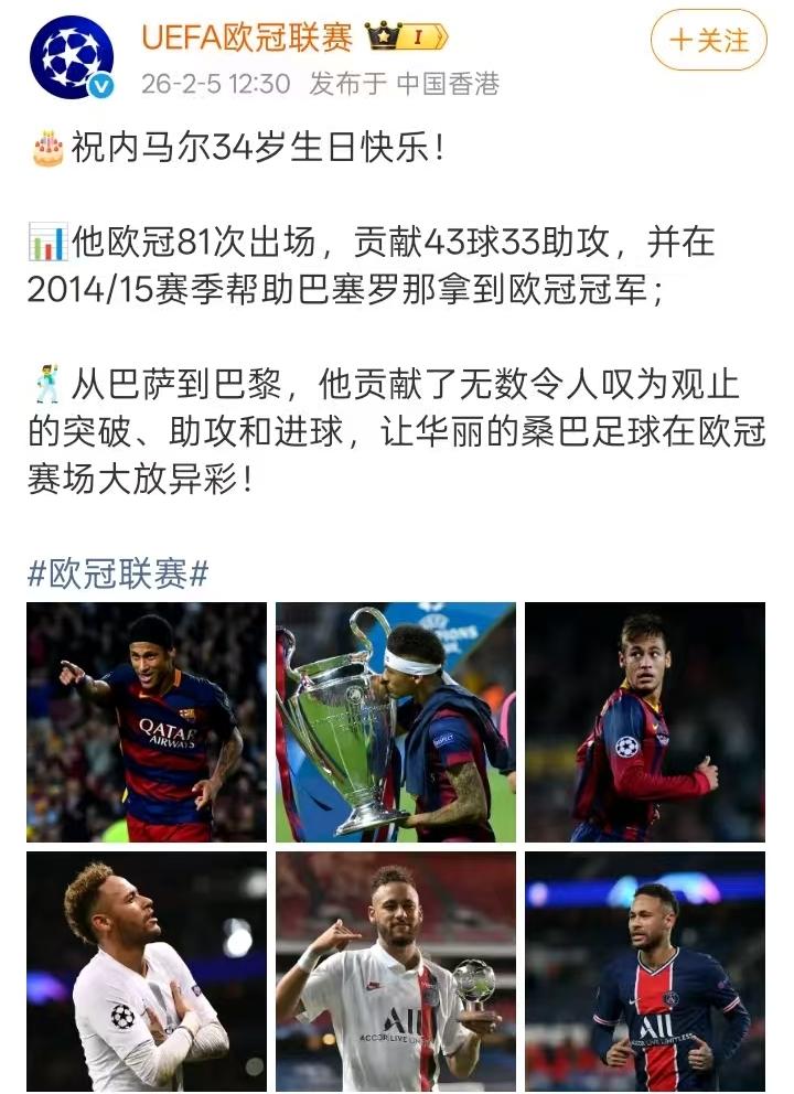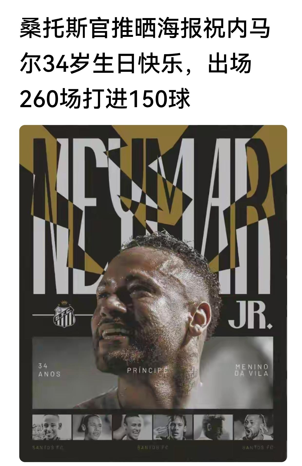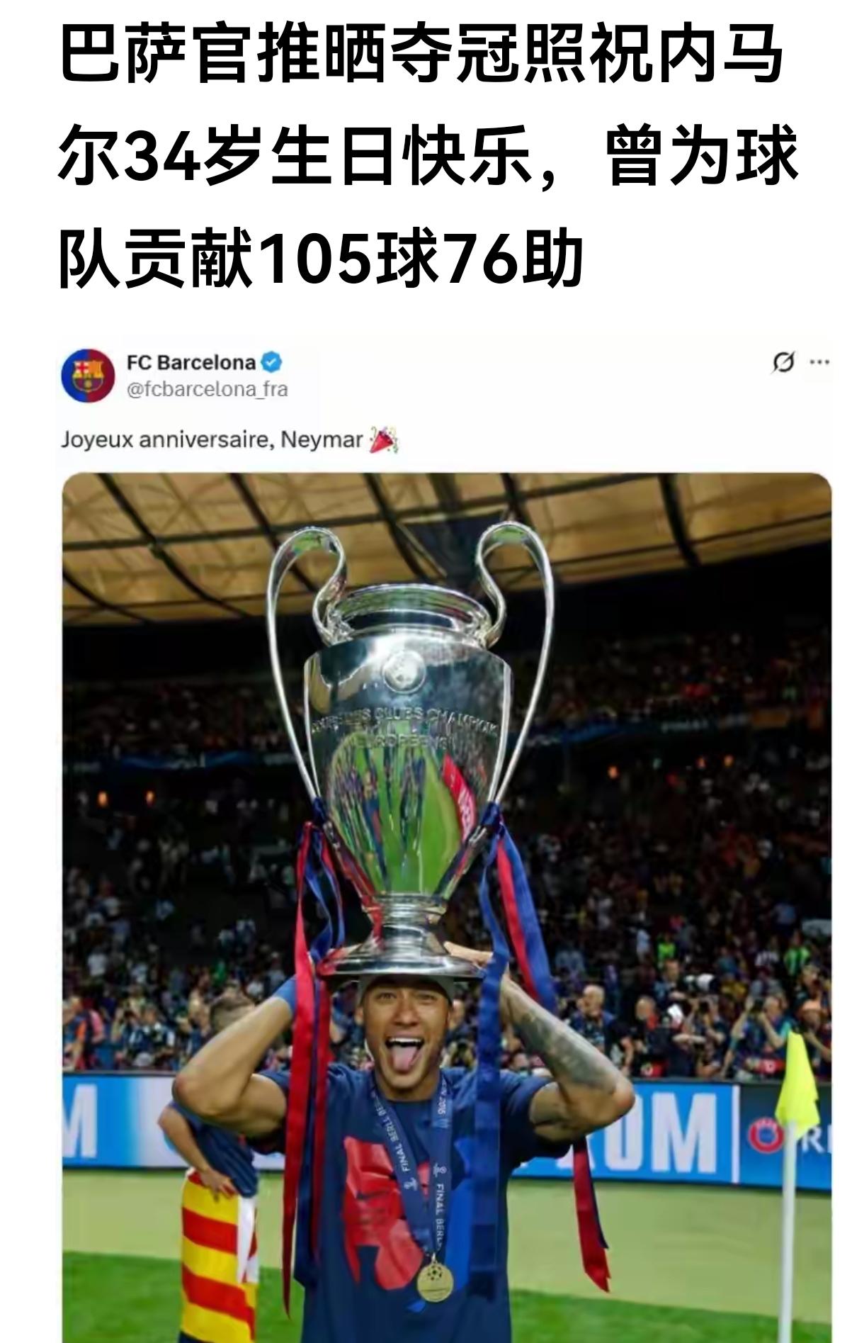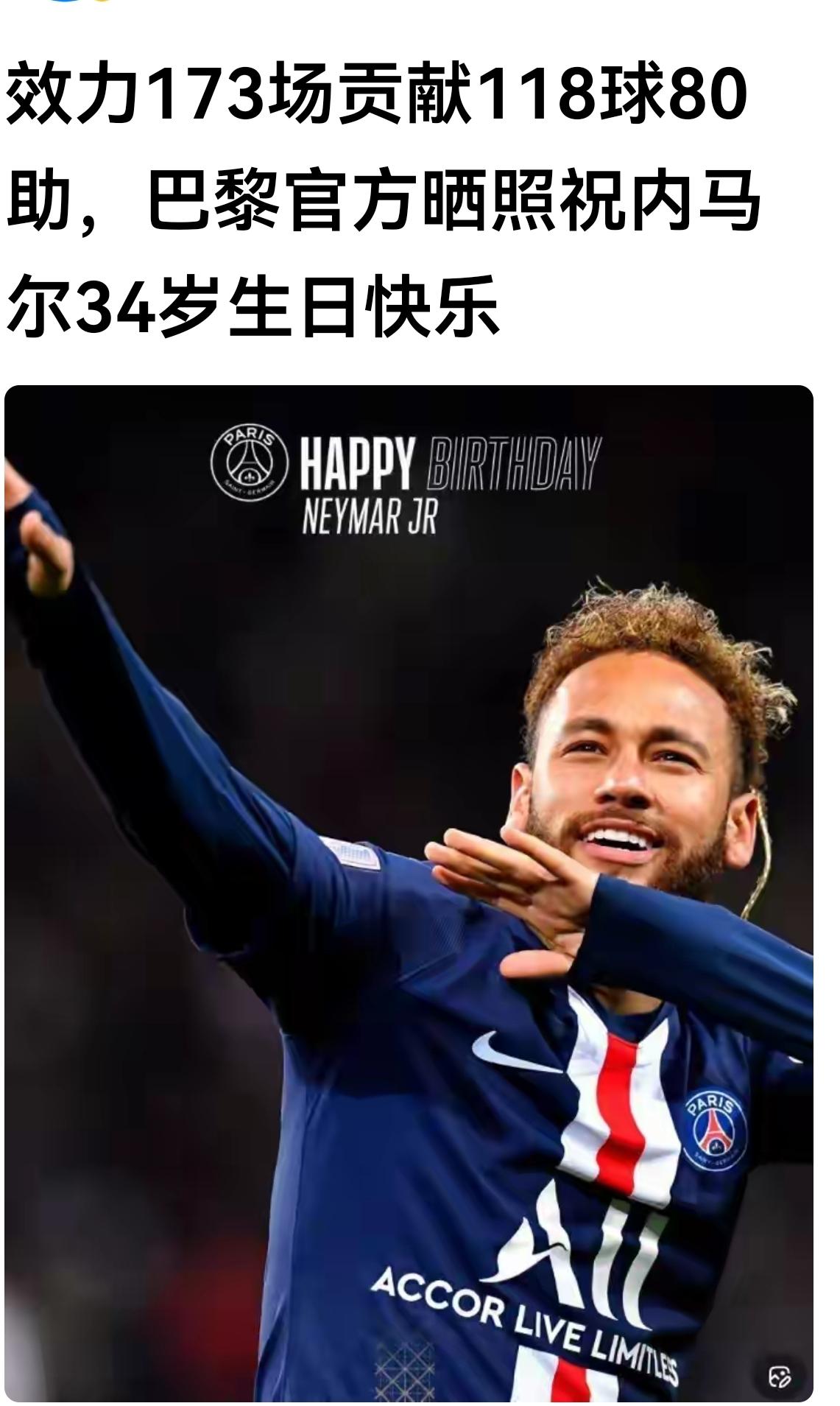 今天内马尔 生日,内马尔以前和现在效力过的俱乐部都送上了祝福! 祝福内马尔生日快乐![玫瑰][玫瑰][蛋糕][蛋糕][送自己一朵花][送自己一朵花] 内马尔代表巴萨出场186场贡献了105球76助。 内马尔代表巴黎173场贡献了118球80助。 内马尔代表桑托斯260场打进150球。 内马尔欧冠比场81场贡献了43球33助。