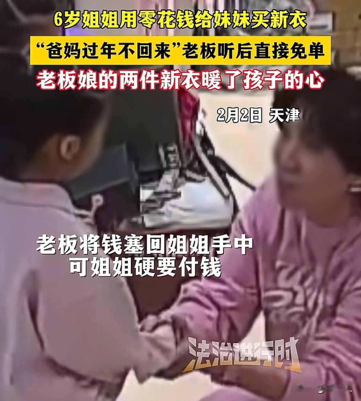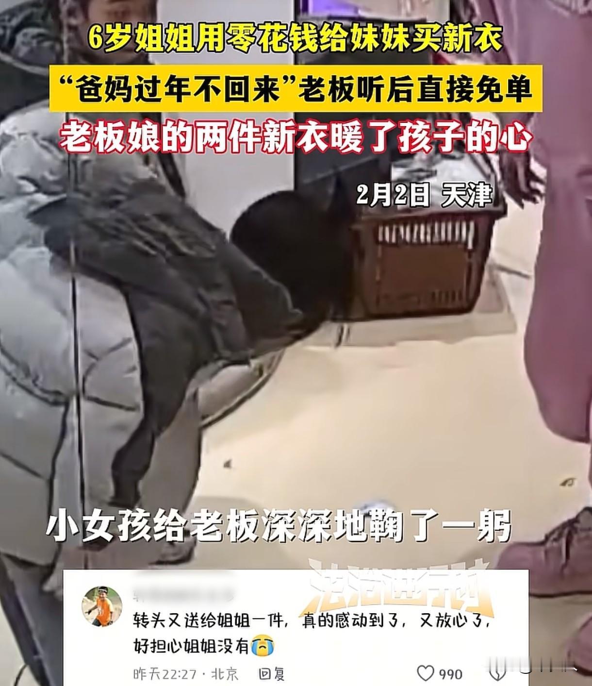 天津,女子开了一家服装店,两个女孩进店,6岁姐姐拿出自己的零花钱,说父母不回家过年,她想给妹妹买件外套。女店主不要钱,可女孩坚持要给,她接过女孩的零钱,放在吧台上,给妹妹挑了一件外套穿上,又给姐姐挑了一件一模一样的,坚持把钱塞回女孩兜里,女孩接下来的一个举动,让人泪目。 女子经营着一家服装店,2月2日这天,她正在店里忙碌,突然从外面进来两个5、6岁的小姑娘,身边没有大人陪同。 女子见状,迎了上去,蹲下身,问女孩有什么需要? 其中一个小姑娘,从裤兜里拿出了一把零钱,之后又从另一边的口袋也拿出了一些钱,她把钱递给女子,说明了来意:快过年了,她想给妹妹买件外套,这是她存的零花钱。 女子有些惊讶,问过之后才知道,女孩的爸爸妈妈不回家过年,女孩这才来给妹妹买新衣服的。 两个孩子穿着单薄,在这寒冷的天气里,小脸都冻得红扑扑的,女子心中一软,把钱递回给女孩,可女孩没有接。 她只好把钱随手放在吧台上,交代女孩,说自己给她们选衣服去,让女孩等一下。 之后就转身进去货架里面,拿了外套出来,给妹妹穿上后,贴心的提醒他们回家。 可她又像想起什么一样,赶紧叫住姐妹二人,让她们稍等一下,之后她小跑着进去,从货架上又拿出一件外套,给姐姐穿上。 之后又弯腰找了两副手套,给孩子们穿戴好。 忙完这一切,女子又把零花钱塞回女孩手中,温柔地说:“衣服阿姨送给你们俩了。” 姐姐一开始使劲推脱,她虽然年纪小,但似乎也知道无功不受禄的道理,坚持要付钱。 女子直接把钱放回了姐姐的衣服兜里,姐姐见拗不过,深深地鞠了一躬,真诚道谢。 这一刻,双方的举动都让人觉得很温暖。 有网友说看到妹妹穿上新衣服的时候,担心姐姐没有,可一转头,看到老板给姐姐也拿了一件,真的被感动到了,也放心了。 也有很多网友说要给两个孩子买单,可老板娘都婉拒了。 看到女孩鞠躬的瞬间,眼泪都出来了,太懂事的小女孩。 女店主看到两个女孩这么小,穿着单薄进店,在得知女孩的来意后,没有说女孩的钱不够,或者其他的,直接给孩子们拿来衣服穿上,还说送给他们,并且没有厚此薄彼,给两个孩子都送了新外套和手套。 她用自己的善良和爱心,为两个孩子撑起了一片温暖的天空,这份关爱,会让孩子们温暖整个童年,也会让他们铭记于心,女孩的深深一鞠躬,也让我们看到了她的懂事和懂得感恩。 女店主将衣服送给两个女孩,属于无偿赠与行为。 《民法典》第657条规定:赠与合同是赠与人将自己的财产无偿给予受赠人,受赠人表示接受赠与的合同。 女店主明确表示将衣服和手套送给两个孩子,孩子们也接受了这份好意。 在他们的身上,我们看到了人性的美好,希望这份温暖能够一直延续下去。 人生在世,但行好事,莫问前程。 也祝愿老板娘的生活幸福美满,生意蒸蒸日上!