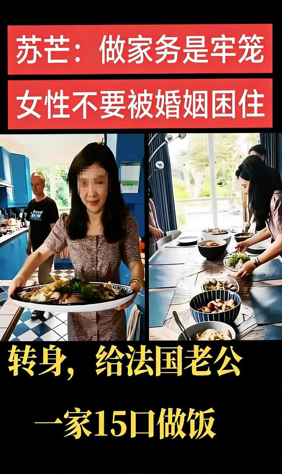 一句“法兰西第一女仆”,让苏芒破防了。 那个曾经在京圈名利场呼风唤雨,永远站在C位,被众星捧月的前时尚主编,一转身,去了法兰西,然后,开始洗手作羹汤。 社交媒体上,她晒出的不再是高定礼服和明星合影,而是锅碗瓢盆和亲自下厨的背影。人设,从杀伐果断的女魔头,急转直下,变成了岁月静好的贤妻。 您当年可不是这么说的啊!在国内对着镜头大谈“家务是牢笼”,把相夫教子视作“可耻的投降”。 转头到了法国婆家,却系着围裙天不亮就采购,为十五口人忙前忙后炖牛肉、爆鲜虾,这变脸速度比时尚圈换季还快。 别忘了您2008年上《鲁豫有约》的豪言,说穿秋裤会“被外国人歧视”,还翻员工行李箱没收秋裤。 合着国内的本土习惯就是“老土”,国外的家庭主妇角色就成了“岁月静好”?这崇洋媚外的劲儿,真是刻进骨子里了。 当年在国内当时尚总裁,对着张韶涵说“蹲下”抢占C位,鼓吹“650元早餐不够吃”。 到了法国,却心甘情愿围着洋婆家的灶台转,昔日“杀伐果断”的女魔头,怎么就成了洋亲戚的免费厨娘? 您说“人该为自己想要的人生活”,可您的“想要”怎么分中外两套标准? 国内鼓吹女权、贬低家务劳动,到了国外就全盘放弃原则,这哪里是自由选择,分明是对着西方的刻意讨好。 嘴上喊着“活出自我”,行动上却把外国人的认可当圣旨,连穿衣习惯都要靠西方眼光定义。 这种精神上的自我殖民,比穿不穿秋裤、做不做家务更可悲。 国内挣够了“独立女性”的光环,转身就去国外践行“贤妻良母”,合着女权只是您在国内博眼球的工具? 崇洋那是你个人的事,可拿着双重标准忽悠人,把本土习惯踩在脚下抬高西方,就太让人不齿了。 各位读者你们怎么看?欢迎在评论区讨论。