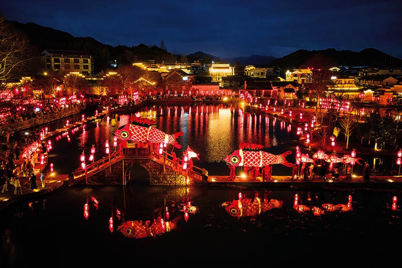 1月19日,游客在黄山市徽州区呈坎古村观赏鱼灯表演。张大岗/摄