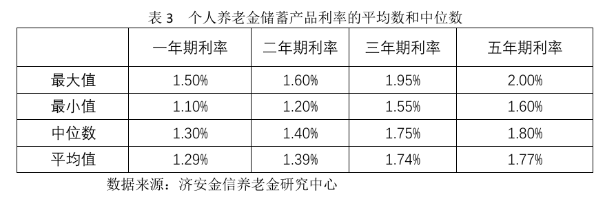2026年1月初,济安金信养老金研究中心调研了23家银行发行个人养老金储蓄产品的存款利率情况,不同期限储蓄产品的平均利率和中位数等如表3所示。