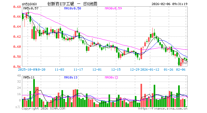 2月6日,创新药ETF工银(516060)开盘涨0.00%,报0.575元。创新药ETF工银(516060)重仓股方面,药明康德开盘跌0.75%,恒瑞医药跌0.72%,华东医药跌0.03%,复星医药涨0.30%,科伦药业跌0.22%,百济神州跌0.58%,长春高新跌0.19%,康龙化成跌0.69%,泰格医药跌1.10%,艾力斯涨0.17%。