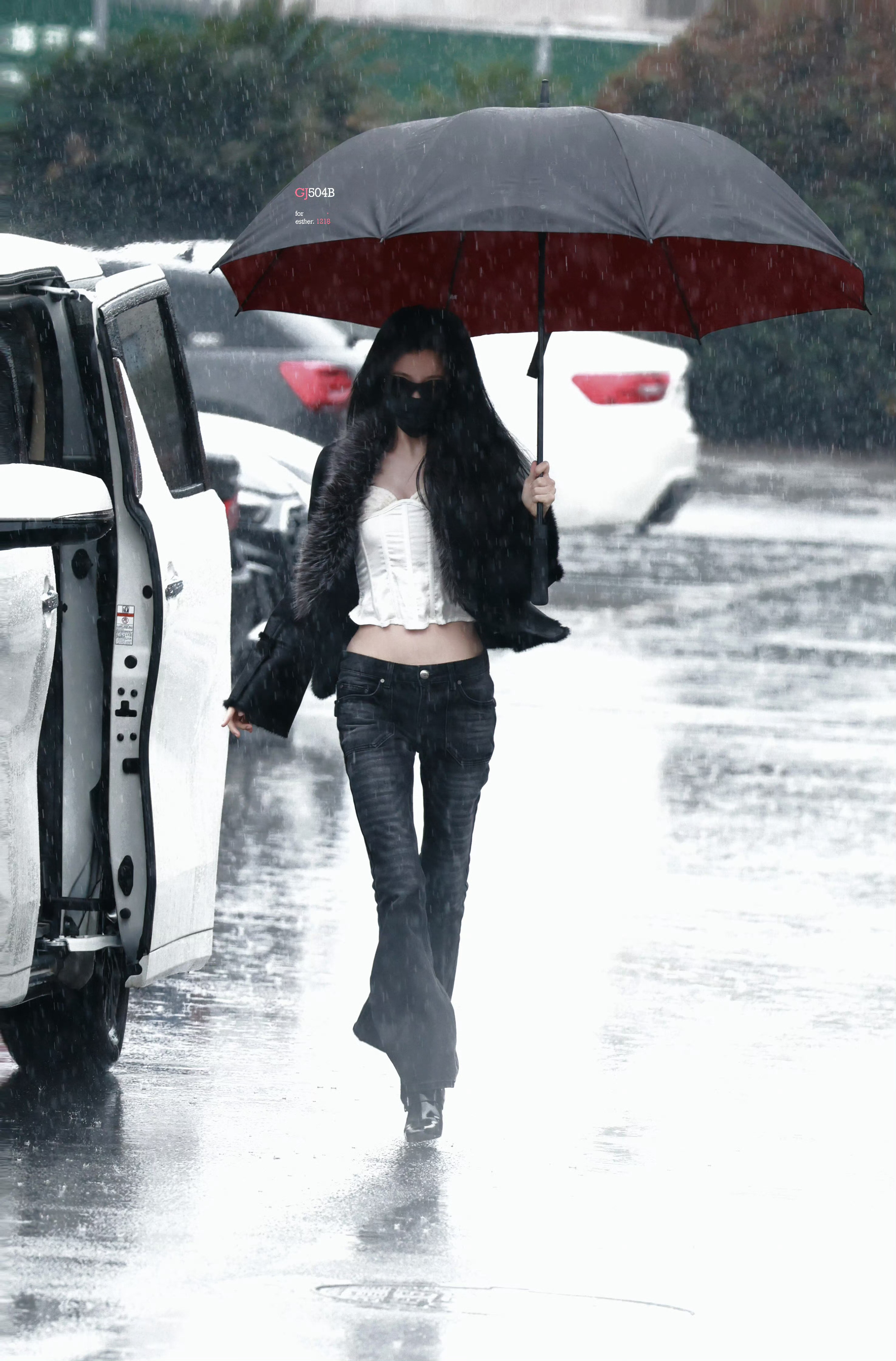 虞书欣雨中撑伞上班虞书欣皮衣低腰裤look