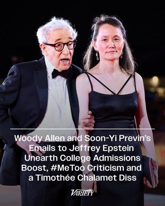《综艺》消息:爱泼斯坦案曝光的一系列邮件中,还有伍迪·艾伦妻子宋宜·普列文与爱泼斯坦的一系列邮件,其中包括: