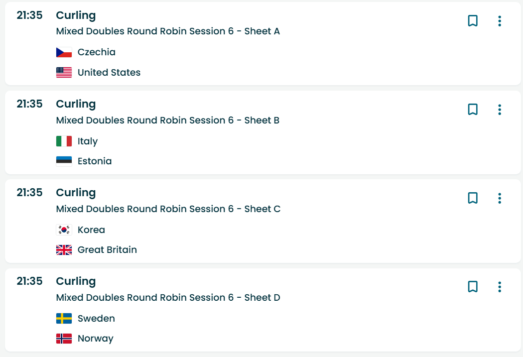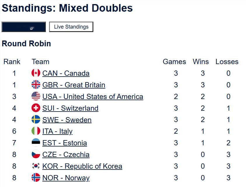 【今日奥运冰壶赛程】今天可以看两轮混双冰壶循环赛:北京时间17点的轮次(图一),瑞典-苏格兰、意大利-瑞士、美国-加拿大都非常有看点:苏格兰、加拿大和美国能否延续全胜?瑞典、瑞士和意大利都需要一胜稳定排名。21点半的轮次(图二)也非常好看。由于开幕式的缘故,明日凌晨没有轮次。