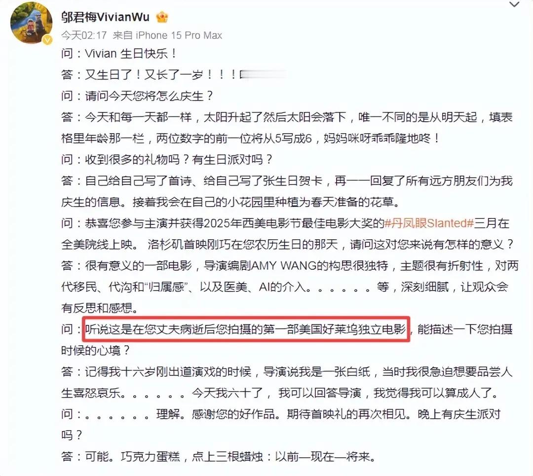 60岁邬君梅首曝丈夫病逝,30年跨国深情惹人泪,治愈式庆生显通透2月5日,
