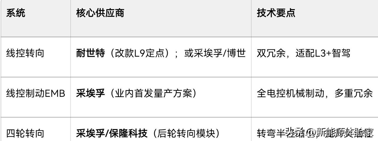 理想L9 Livis全主动底盘核心供应商与关键信息如下,按系统拆解: 一、800V全主动悬架(核心) 行业主流消息:采埃孚ZF提供主动作动器+核心控制(与蔚来ET9同源技术)。 本土配套:孔辉科技/保隆科技供应空气弹簧;天纳克供CDC减振器,理想做软件自研与系统整合 。 关键特点:800V高压、单轮万牛级举升、无防倾杆,公路姿态控制拉满。 二、全线控底盘(三大件) 附图 三、关键结论 1. 核心技术来源:采埃孚提供主动悬架作动器与EMB制动,是“完全体”线控底盘的核心供应商。 2. 本土协同:孔辉/保隆/天纳克负责空簧、减振等配套,理想自研软件与系统集成,实现技术落地与成本控制 。 3. 模式本质:理想是“顶级集成+软件自研”,非全栈自产,供应链整合能力是关键。