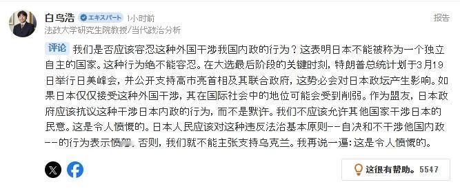 特朗普支持高市竞选,日本舆论破防:美国干涉我们的内政 特朗普终于想起了日本,不过没提日本被中国制裁的事,仅表示支持高市早苗竞选——5日,特朗普在社交媒体上发文称,他完全支持高市早苗及其执政联盟参与此次日本众议院选举,并期待高市于3月19日到访白宫。 值得注意的是,不知道是有意还是无意,特朗普在吹捧高市早苗的同时,还顺带点了一下美日达成的贸易协议,似乎是在暗示高市早苗应尽快兑现那项数千亿美元的投资承诺。 当然,更有意思的是,特朗普这句对高市早苗参选的支持却让日本舆论炸锅了,因为高市早苗其中一个竞选主张就是鼓吹日本是一个“独立自主的主权国家”,故而特朗普这句表态在高市的支持者看来,无异于是“干涉”日本内政。 在雅虎新闻的评论区中,有多位日本学者对此表示不满,称特朗普的言论不可接受——这就很滑稽了。日本至今都有美国驻军,居然好意思谈“主权独立”?