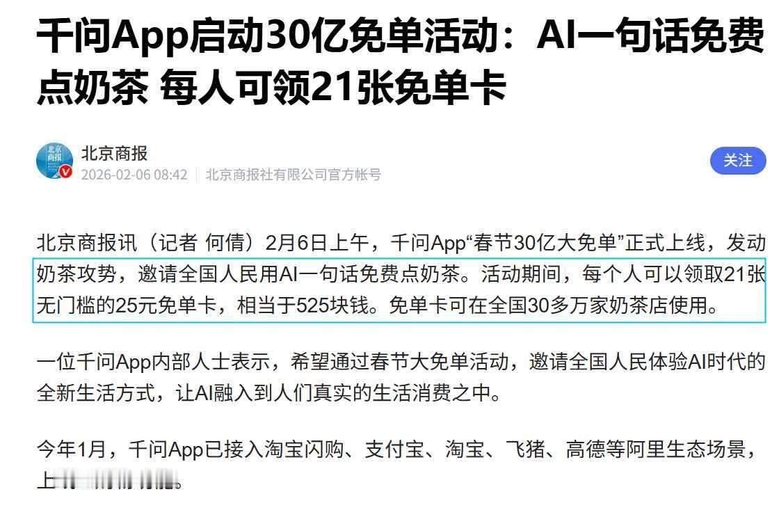 越来越精彩了,千问一出手就是30亿,这春节AI大战攻势真顶不住啊! 今天看到新闻说,千问App上线了一个“春节30亿大免单”活动,每个人只需打开千问就能直接领取一张25元的免单卡,可以在全国30多万家奶茶店使用。 这消息一出,立刻点燃了网友们的热情,也让整个春节的气氛变得更加火热。你说,30亿免单,听起来是不是像天方夜谭?可是,真就这么“砸”在了我们头上!不仅如此,这次的免单活动,还真的让人看到了AI技术背后那份“真诚”的温度。 想象一下,春节期间,街头巷尾排着长队的人们,手中拿着那张“免单卡”,脸上挂着期待又兴奋的笑容。无论是学生、上班族,还是带着家人一起来的老人,大家都在这个特殊的节日里,感受到了AI带来的“实实在在”的福利。这种场景,简直像是科技版的“春晚”,让人不由得心生感动:科技,原来还能如此贴近生活,成为温暖人心的力量。 而更令人惊喜的是,千问不仅仅是在打折促销,它背后反映出的是一种“用心”的态度:用大数据、AI算法,精准匹配用户的需求,带来真正实在的福利。它不像传统的广告套路那样空洞,而是用实际行动,告诉我们科技可以为普通人带来更多便利和幸福。这不禁让人反思:在这个信息爆炸的时代,谁还能像千问这样,把“惠民”做得如此真切? 当然,也有人开始吐槽:“这免单能不能持续?会不会一秒钟就被抢光?”但更多的人则看到了背后的深意:在竞争激烈的市场中,千问用这份“30亿大免单”传递出一个信号——科技要为人们谋福利,要让普通人都能享受到科技带来的红利。这不正是新时代的“正能量”吗? 这波“春节AI大战”背后,是一场关于人性与科技的深度较量。它告诉我们,真正的“爆款”不是空洞的承诺,而是用心做出来的每一份实实在在的福利。或许,这才是真正的“赢”——让科技变得有人情味,让生活变得更温暖。 看完这消息,谁还能不期待未来?在这个春节,让我们用一颗感恩的心,迎接科技带来的每一份惊喜。因为,真正的幸福,不在于你拥有多少,而在于你能用科技和善意,点亮身边的每一个人。千问ai 千问APP 千问AI助手 AI千问 千问APP崩了 ai百问 千问Qwen