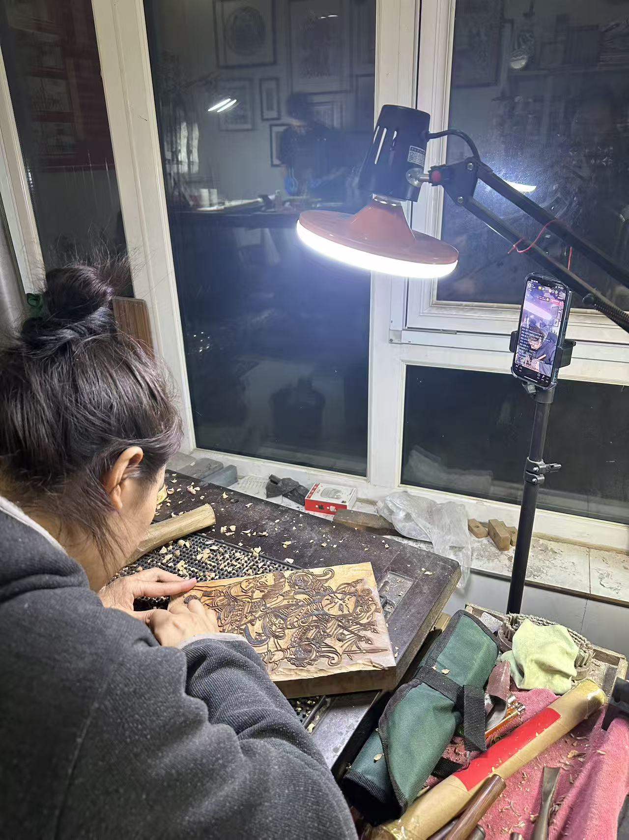 夜渐深,直播间人数仍在上升。韩冰拿起一块新的杜梨木板,刀起刀落间,新的形象在指尖诞生。在这间充满木香的工作室里,年画的故事,正在写下新的篇章。