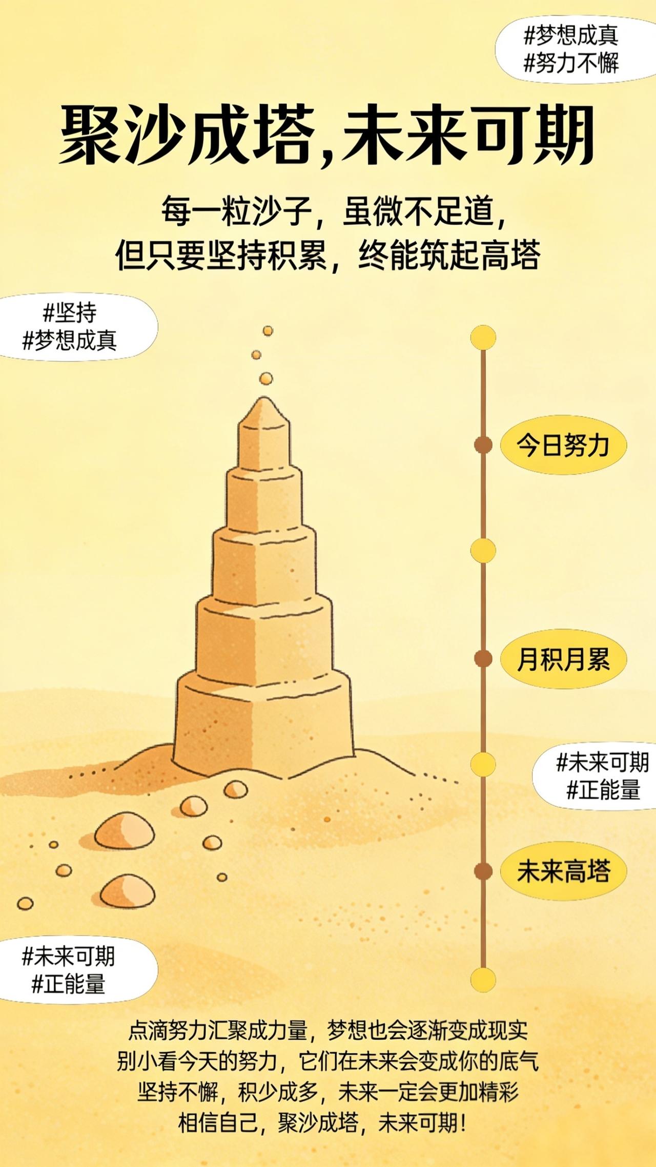 聚沙成塔,未来可期 每一粒沙子,虽微不足道,但只要坚持积累,终能筑起高塔。成功也是如此,点滴努力汇聚成力量,梦想也会逐渐变成现实。别小看今天的努力,它们在未来会变成你的底气。坚持不懈,积少成多,未来一定会更加精彩。相信自己,聚沙成塔,未来可期! 坚持 梦想成真 努力不懈 未来可期