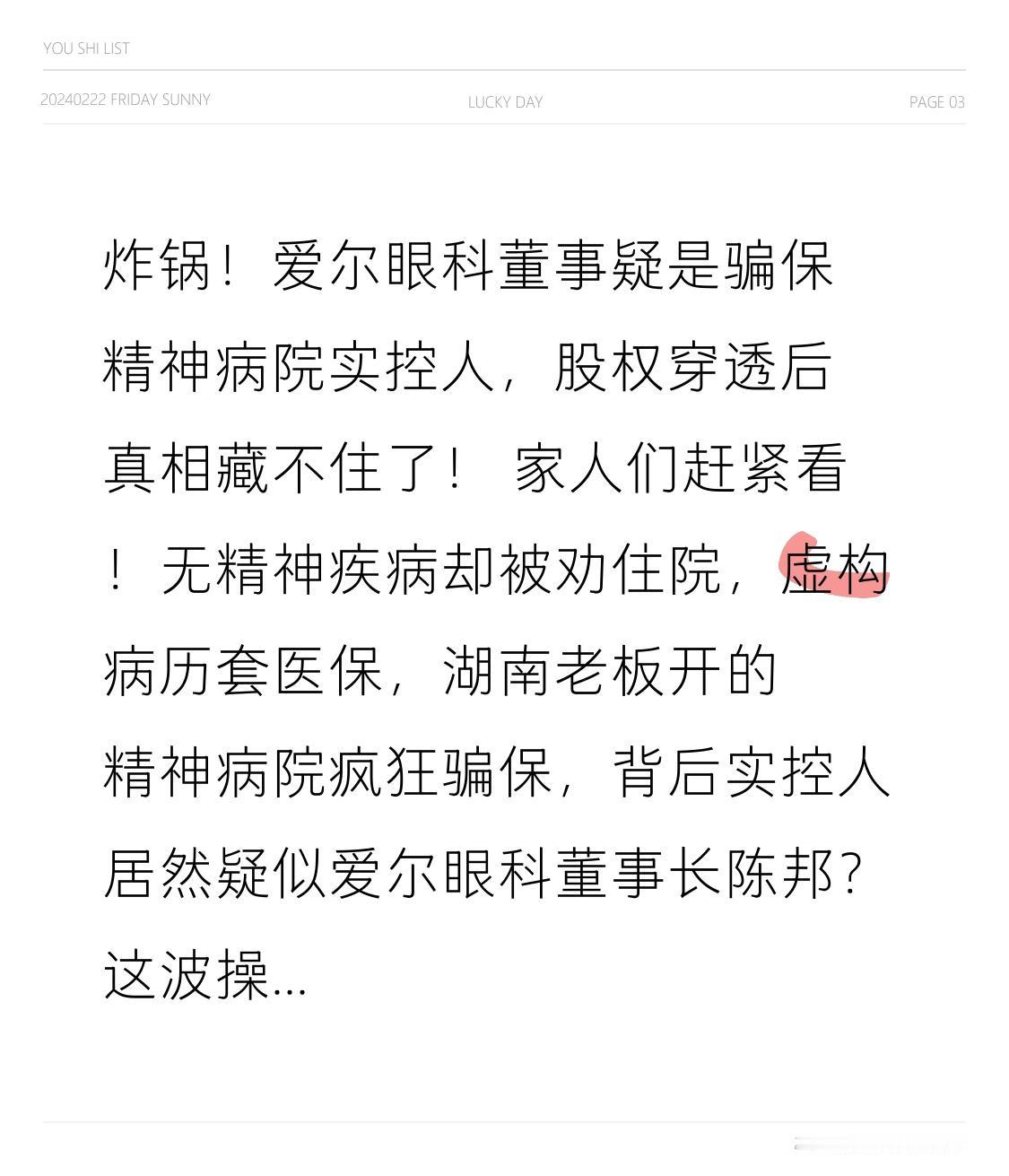 炸锅!爱尔眼科董事疑是骗保精神病院实控人,股权穿透后真相藏不住了! 家人们赶紧看!无精神疾病却被劝住院,虚构病历套医保,湖南老板开的精神病院疯狂骗保,背后实控人居然疑似爱尔眼科董事长陈邦?这波操作直接让全网炸了锅! 事情要从湖北襄阳的暗访说起,记者伪装探访时,襄阳恒泰康医院的医生简直刷新三观:明明村民没任何精神问题,医生却拍胸脯保证“能办住院”,还手把手教篡改病历——“别说是戒酒,要写成酒精引起的精神障碍,医保才给报”!更离谱的是,这家医院长期滞留达标患者,甚至播放8分钟公共广播就收“音乐治疗费”,把骗保玩成了流水线。 就在大家痛骂黑心医院时,股权穿透结果让所有人惊掉下巴!天眼查一扒,这家骗保医院的股权链直指爱尔眼科:陈邦控股的爱尔医疗投资集团,间接持有涉事医院母公司82%股份,而涉事集团官网明晃晃写着“爱尔医疗投资集团控股”,旗下16家精神病医院都在这条资本链上!消息一出,爱尔眼科股价直接低开暴跌,半天市值蒸发37亿,网友们炸开了锅:“眼科巨头居然偷偷干精神病院,还靠骗保赚钱?” 可转折来了!爱尔眼科紧急发声明切割:“涉事医院是四级子公司,不在上市公司体系,陈邦不参与经营”!这番回应直接引发更大争议:股权穿透清清楚楚,官网还挂着控股标识,现在说没关系?网友锐评:“投资人能享受收益,出了事就甩锅‘不参与经营’,天下哪有这等好事?”更让人揪心的是,精神科骗保本就隐蔽,患者大多缺乏民事行为能力,根本没法核实诊疗项目,医保基金成了某些人的“提款机”。 目前国家医保局已经出手,要求全国精神类医院自查自纠,湖北联合调查组也已进驻调查。要知道,医保基金是咱们普通人的“救命钱”,每一分都连着看病吃药的底气,容不得半点挪用!不管是上市公司还是资本方,都该守住底线:医疗的本质是救死扶伤,不是资本逐利的工具。 这件事也给所有人提了醒:医保基金的安全需要全民守护,遇到违规骗保行为一定要勇敢举报。你怎么看资本跨界医疗的监管漏洞?欢迎在评论区留言讨论,点赞转发让更多人关注,一起守护咱们的“救命钱”!