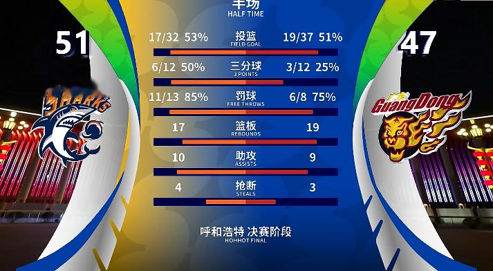 第二节比赛结束,上海51-47领先广东。