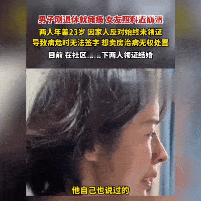 情深!上海这对恋人,藏着太多让人动容的细节。 60岁刚退休的董先生瘫痪在床,37岁的周女士守了他十几年——从二十出头到步入中年,大她23岁的爱人倒下后,她一个人扛下所有照料。最近,俩人靠着按手印的方式,在民政局领了证。 十年相伴没名分,不是不爱,或许是生活的难绊住了脚步。她喂饭擦身、端屎端尿,把日子过成了习惯;他没法动,却用眼神回应着所有依赖。这哪是简单的“照顾”,分明是把对方融进了生命里。 有人说“瘫痪了才领证”太唏嘘,可在我看来,这张证是给十年坚守的交代,是“我陪你到老”的誓言。民政局、残联的特事特办,更让这份爱多了份温暖的注脚。 你身边有这样细水长流的感情吗?评论区讲讲他们的故事。点赞转发,愿每份坚守都被温柔以待~