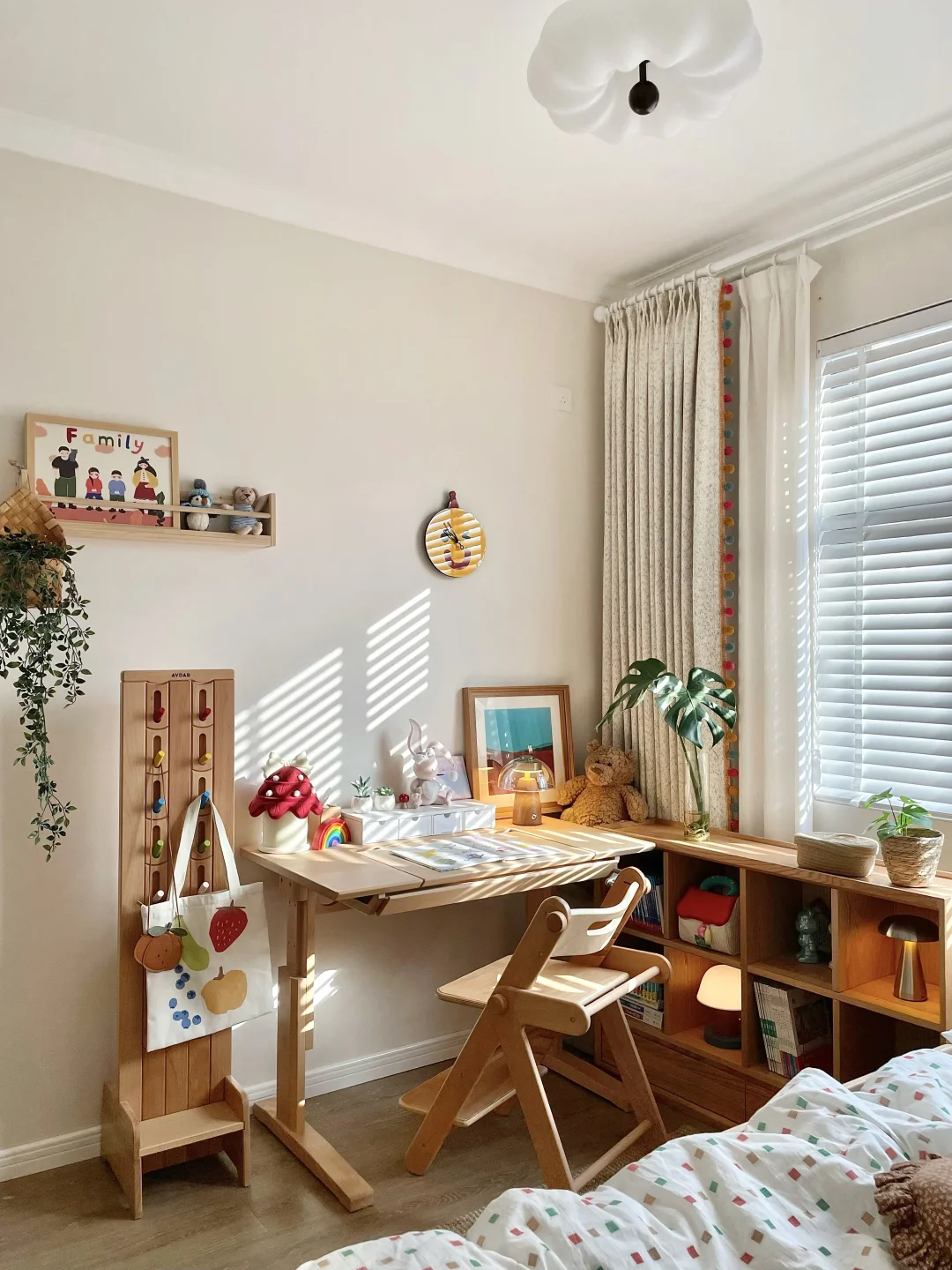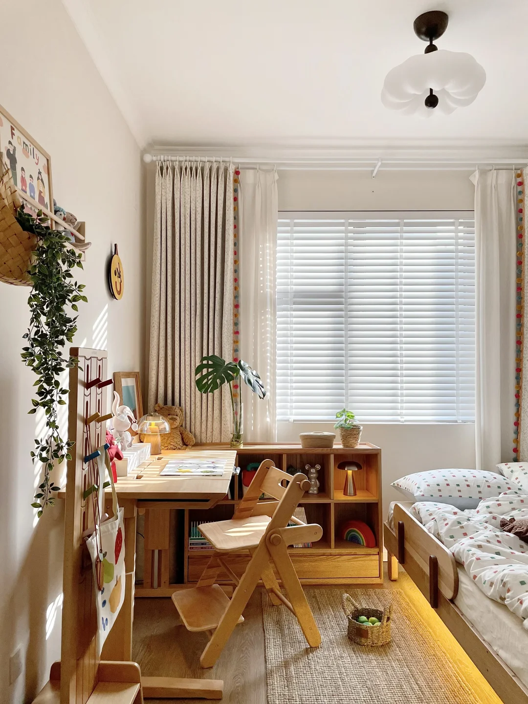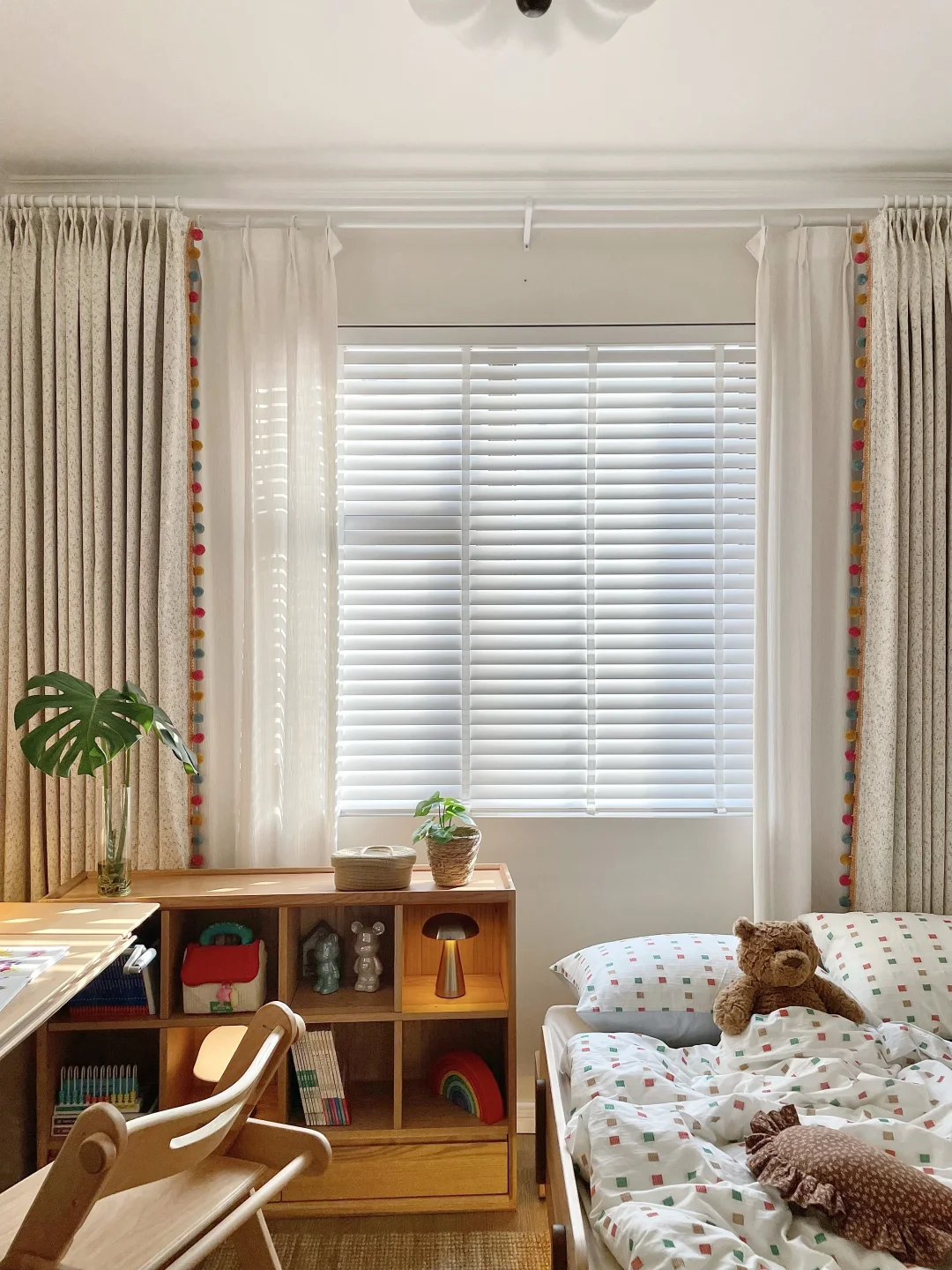 儿童房最纠结的就是窗帘!要环🍃保、要遮光、还要有童趣,再三挑选后终于拿下三千金这套布帘+纱帘+木百叶的组合,真的太喜欢啦💕